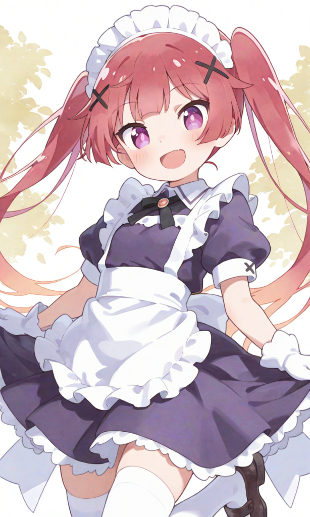 PixAI【Shiitake-Mix】1girl, tanemura koyori, loli, smile, open mouth, maid, maid headdress, puffy short sleeves, white gloves, white thighhighs, cowboy shot, masterpiece, high resolution, high quality, looking at viewer, high-res, red hair, long hair, twintails, x hair ornaments, pinkish-purple eyes, [Watercolor], soft lines, harmonious color palette