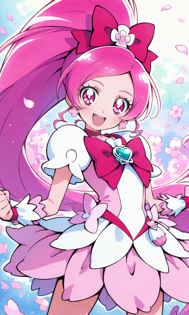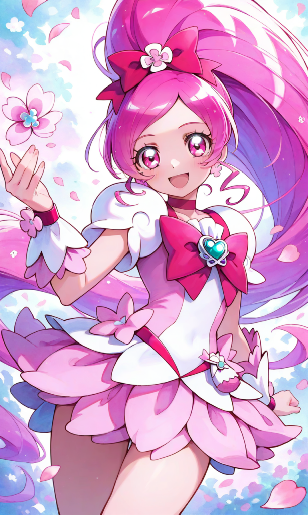 PixAI【Shiitake-Mix】precure,cure blossom, smile,open mouth,cowboy shot, standing, open legs,dynamic pose,looking at viewer, flower petals,masterpiece,high resolution,high quality, ,high-res,[Watercolor], soft lines, harmonious color palette