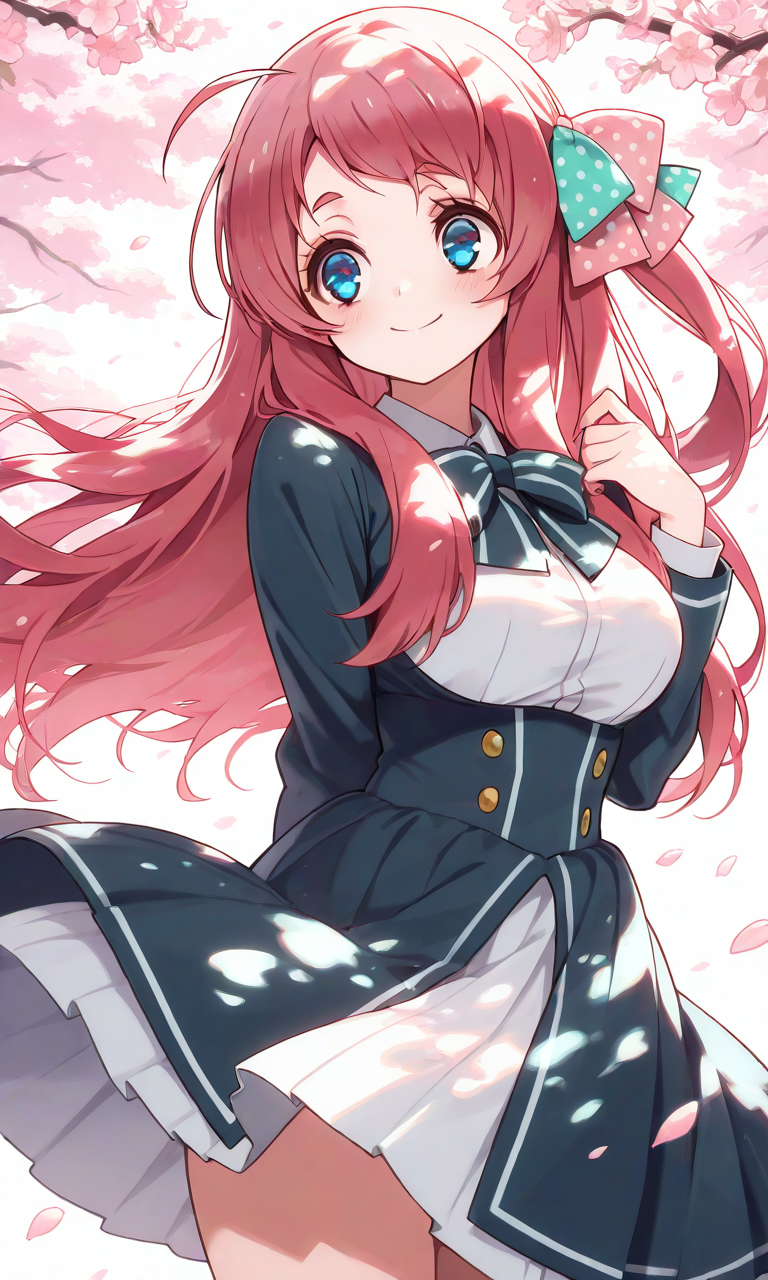PixAI【Shiitake-Mix】minamoto sakura(zombie land saga), smile,cherry blossoms, wind lift, cowboy shot,masterpiece,high resolution,high quality, ,high-res,sakura minamoto, blue eyes, long hair, red hair, one side up, hair bow, green bow, red bow, ahoge, polka dot, polka dot bow, medium breasts,