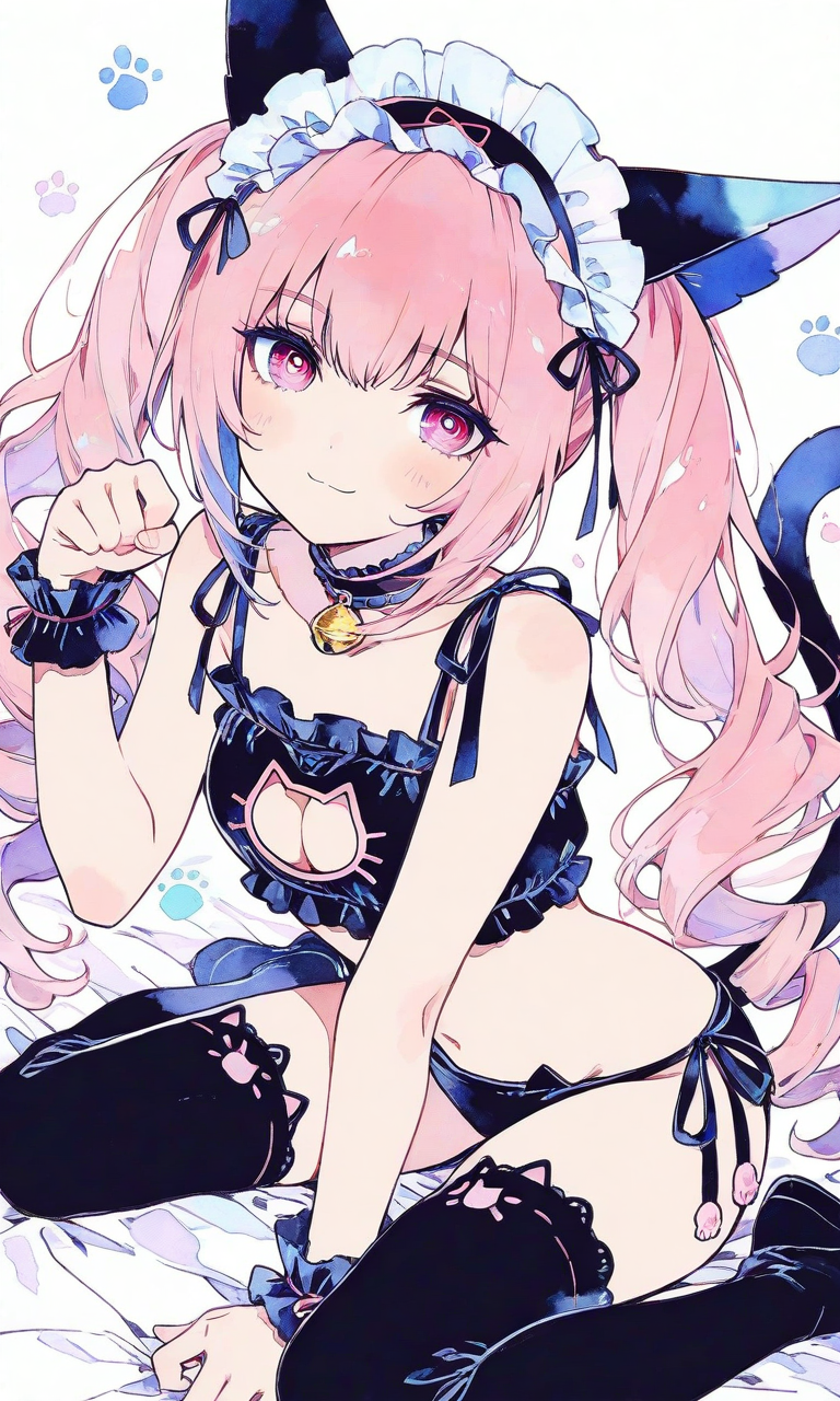 PixAI【Shiitake-Mix】STEINS;GATE,akiha rumiho, pink hair, cat lingerie,white headdress,black thighhighs, wariza, smile,lucky cat pose,cowboy shot,masterpiece,high resolution,high quality, ,high-res,(watercolor_(medium):1.2)(simple coloring,flat color:2)dutch angle,watercolor, sketch style, watercolor effect, pastel colors