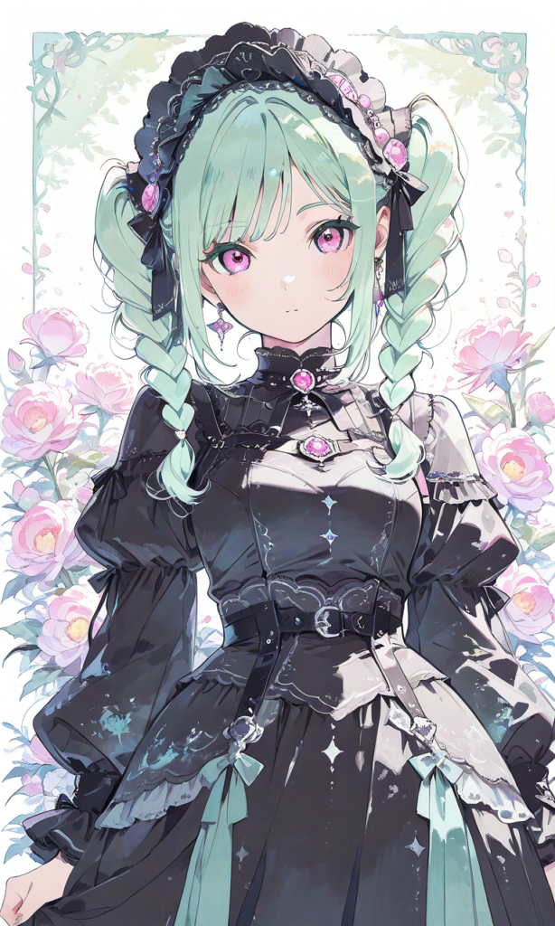 PixAI【Shiitake-Mix】onitsuka tomari, Gothic Lolita,long skirt, headdress, looking at viewer, cowboy shot,white lily, masterpiece,high quality, ,tomari, green hair, purple eyes, pink eyes, medium breasts, twin braids,high-res,♡masterpiece, highest quality, ♡,(watercolor_(medium):1.2)(simple coloring,flat color:2)dutch angle