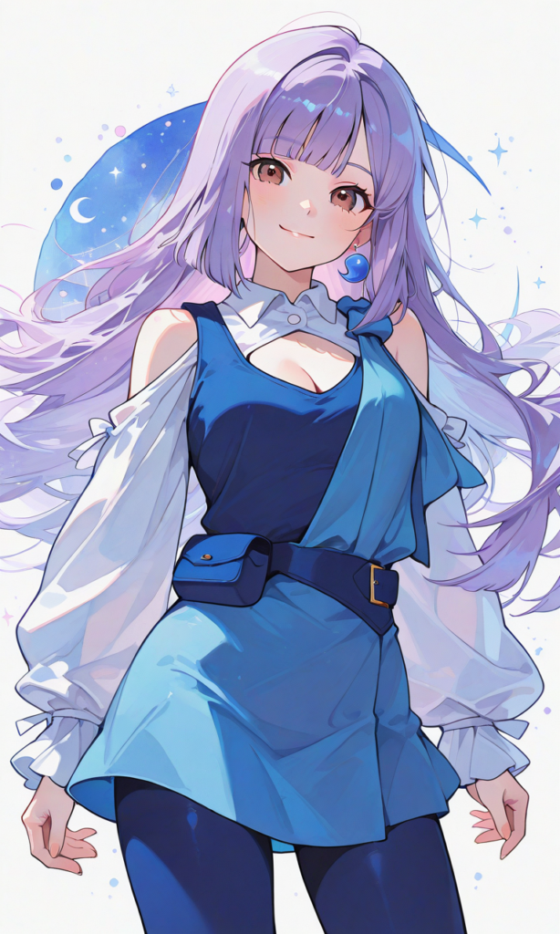 PixAI【Shiitake-Mix】roux louka, smile,looking at viewer, cowboy shot,star (sky), masterpiece,high quality, high resolution,high-res,1girl, solo, RouxLouka, lavender hair, hime cut, long hair, brown eyes, blue tanktop, cleavage cutout, white sleeves, bare shoulder, light blue short dress, fanny pack, blue pantyhose, light blue legwarmers, blue crescent earing,♡masterpiece, highest quality, ♡,[Watercolor], soft lines, harmonious color palette