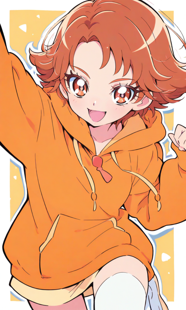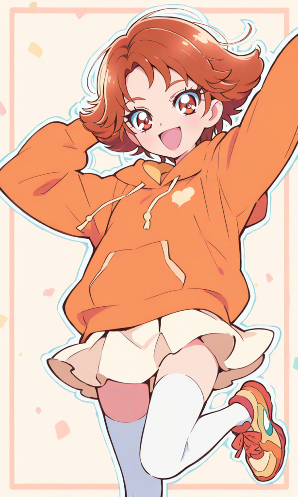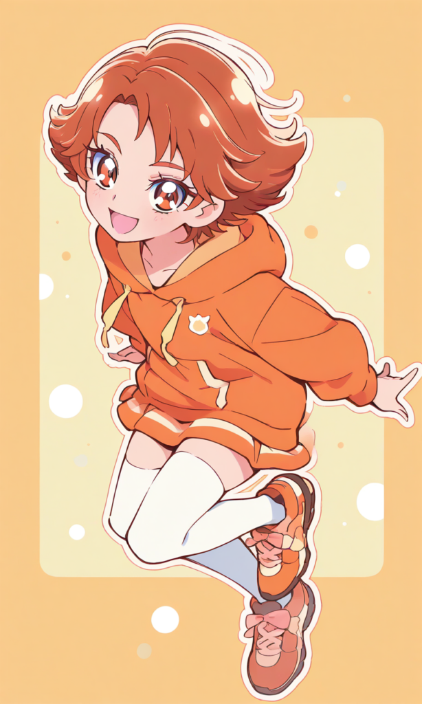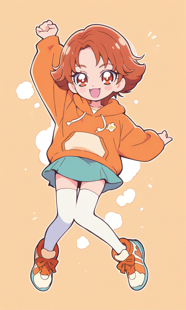PixAI【Shiitake-Mix】Rouge theme,natsuki rin(precure),solo.forehead,short bangs,orange hoodie, miniskirt, white thighhighs,sports shoes, smile, open mouth,cowboy shot,Boyish and energetic,looking at viewer,jumping, smile,open mouth,high-res,Natsuki Rin, brown eyes, brown hair, flipped hair, short hair, ,{masterpiece},{chibi} ,{chibi style anime illustration},{Deformed},{best quality}, {illustration},{thick outline},{outlined vector graphics},{2d cel anime},{flat color style},{simple coloring style},Only one person depicted, big eyes, a short limbs,