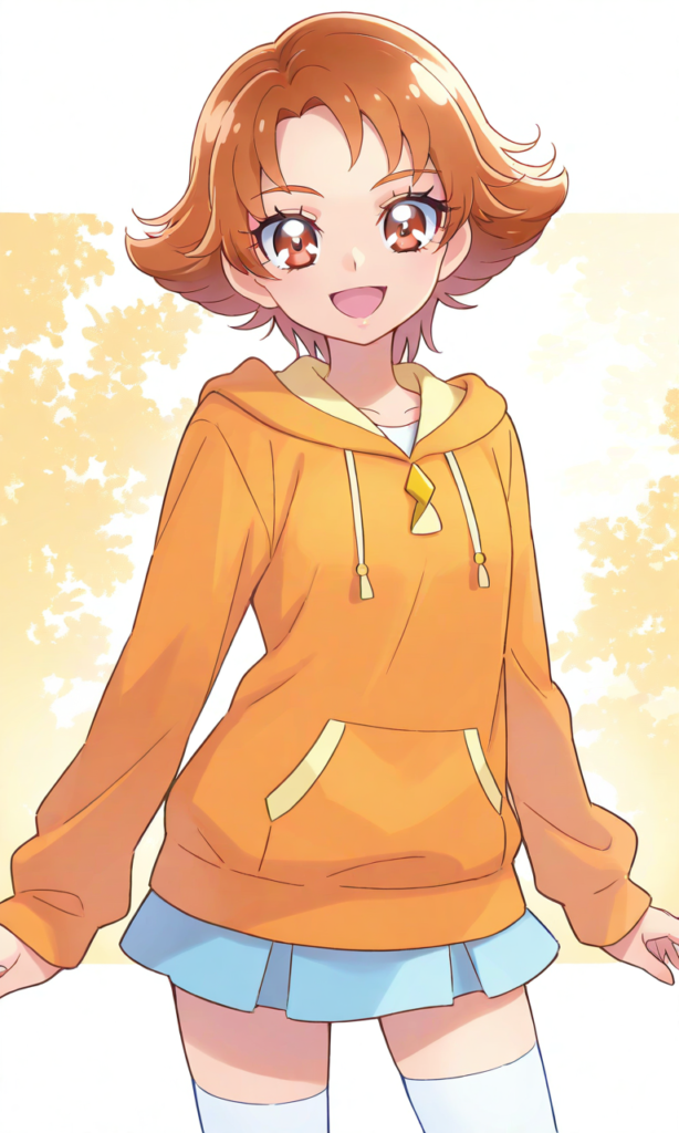 natsuki rin(precure),15 years old,solo.forehead,short bangs,orange hoodie, miniskirt, white thighhighs, smile, open mouth,cowboy shot,Boyish and energetic,looking at viewer, smile,open mouth, ,high-res,Natsuki Rin, brown eyes, brown hair, flipped hair, short hair,