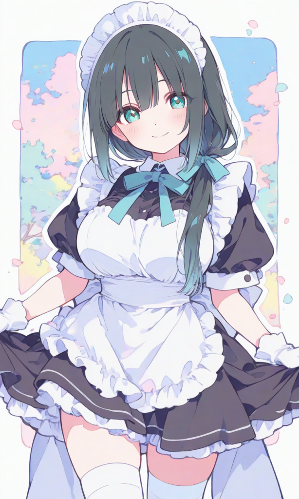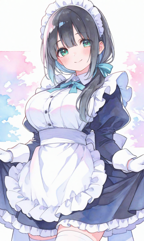 PixAI【Shiitake-Mix】tougou mimori(yuyuyu),(((solo))),low side ponytail, large breast,hair ribbon,maid,white gloves, white thighhighs, smile,looking at viewer, cowboy shot,masterpiece,high resolution,high quality, ,high-res,watercolor, sketch style, watercolor effect, pastel colors,{masterpiece},{chibi style anime illustration},{Deformed},{best quality}, {illustration},{thick outline},{outlined vector graphics},{2d cel anime},{flat color style},{simple coloring style},Only one person depicted, big eyes, a short limbs,