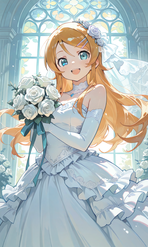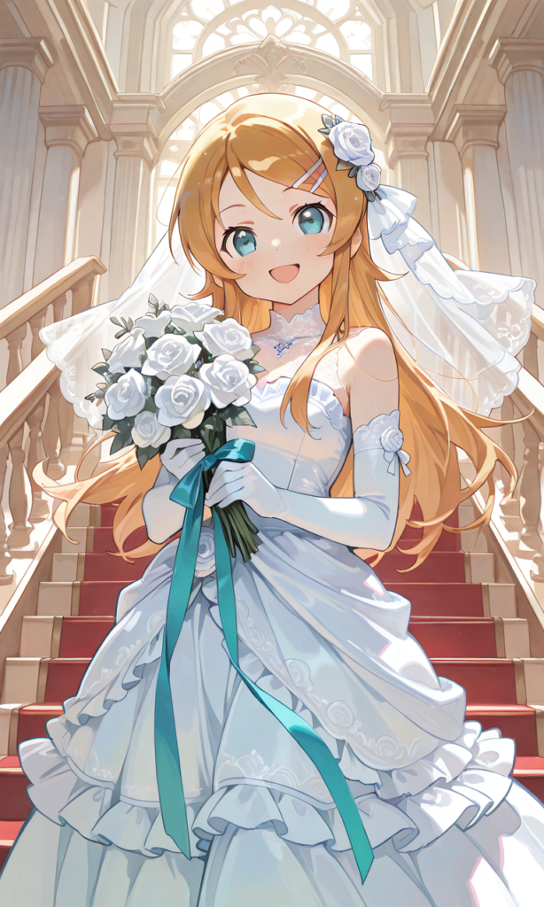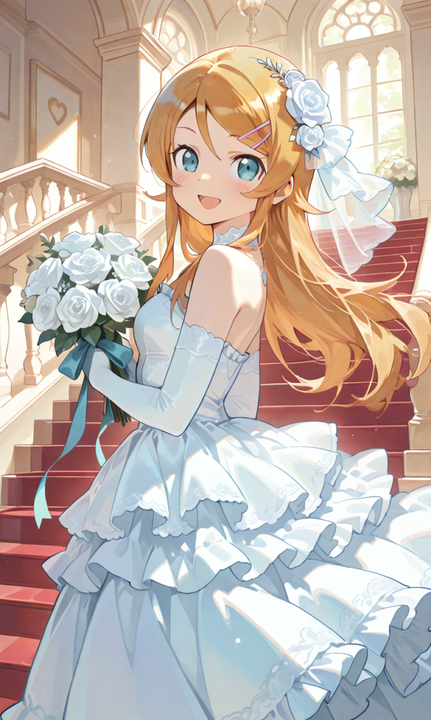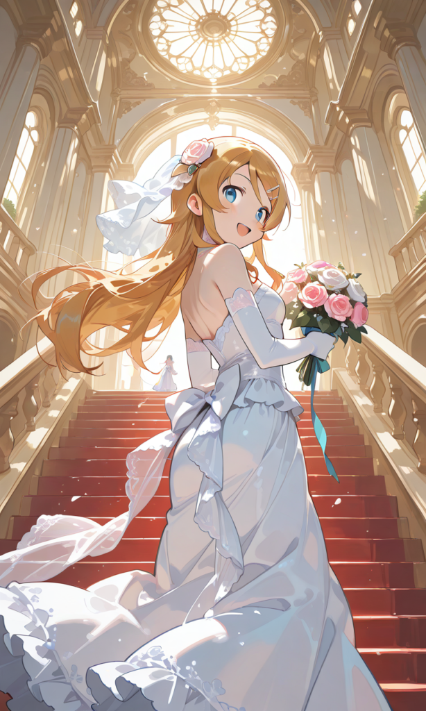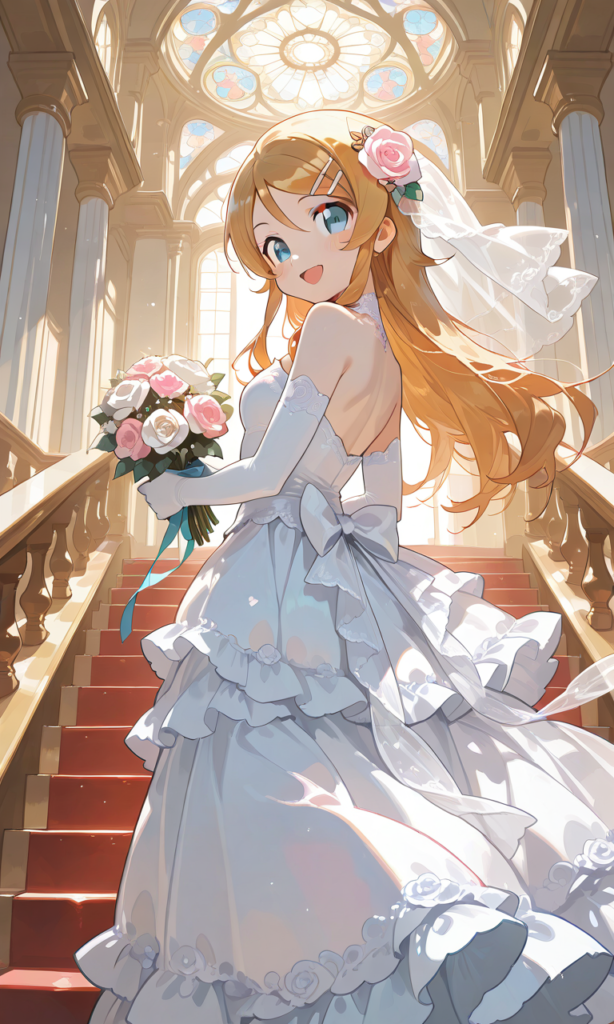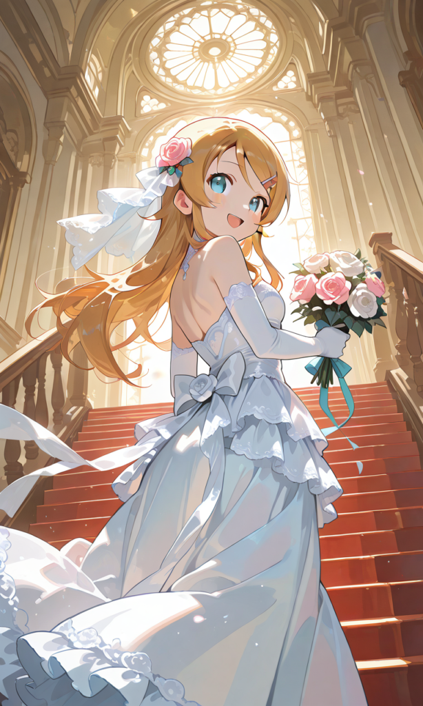 PixAI【Shiitake-Mix】kousaka kirino, wedding dress,frilled dress,long skirt, rose hair ornament,white rose, long skirt, elbow gloves, smile,open mouth, cowboy shot,red staircase,climbing, holding skirt, stainedglass,looking back,from below, masterpiece,high resolution,high quality, ,♡masterpiece, highest quality, ♡,[Watercolor], soft lines, harmonious color palette ,