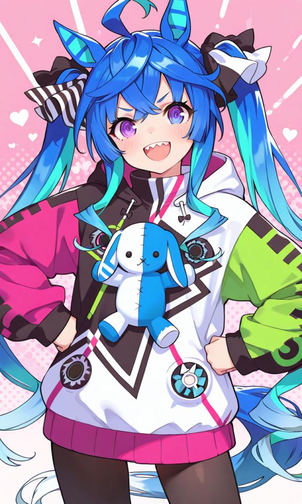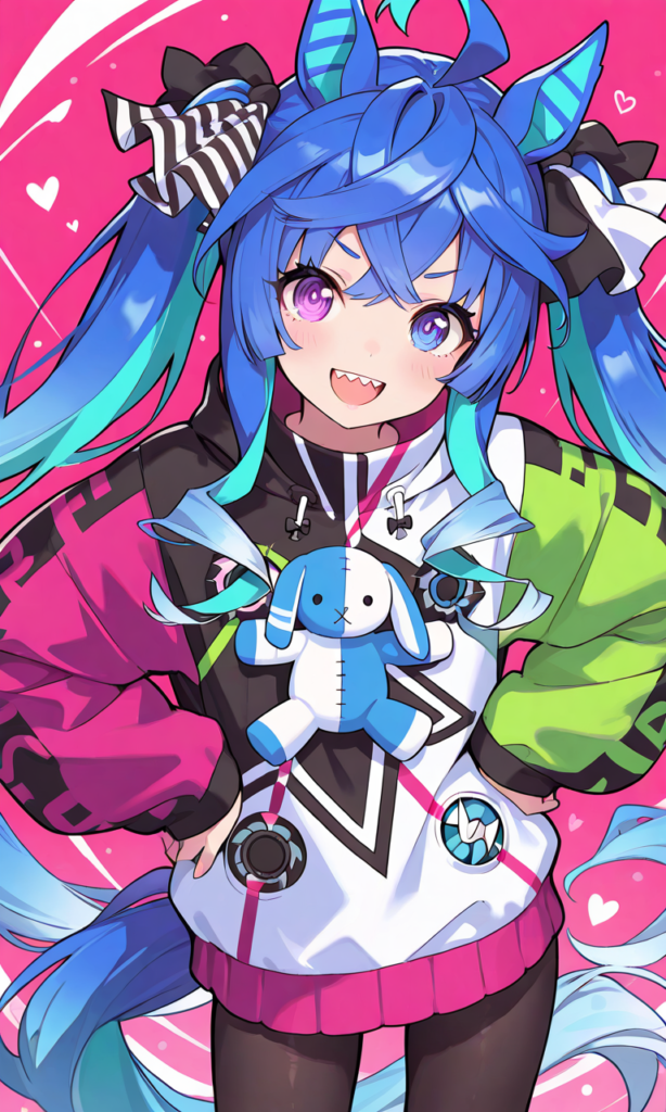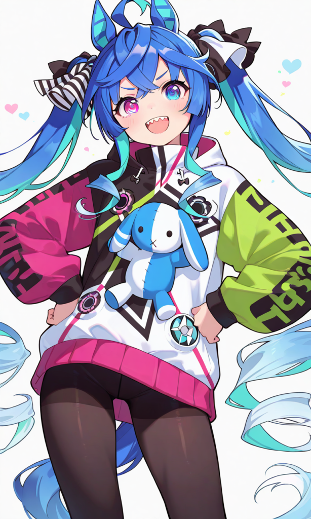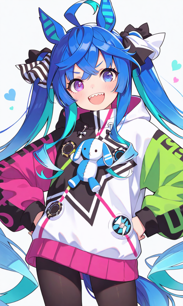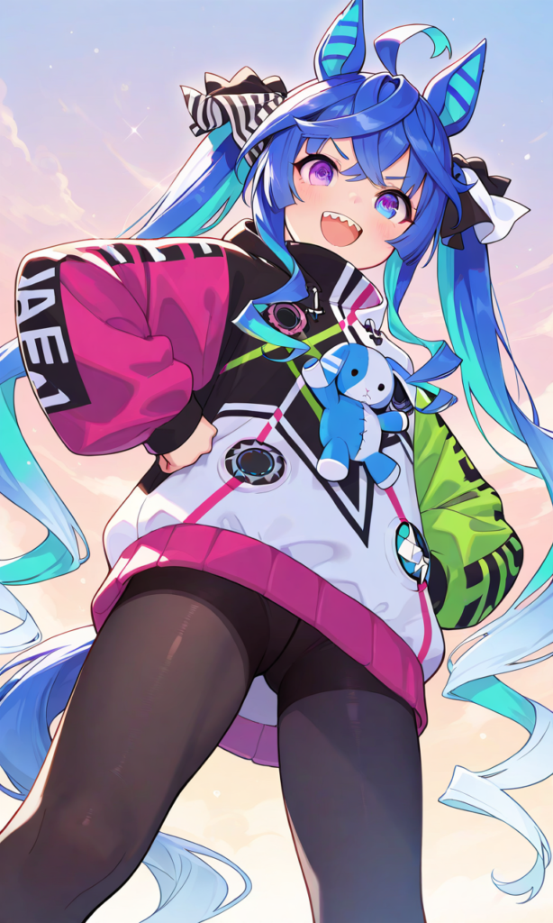 PixAI【Shiitake-Mix】twin turbo (umamusume), solo, smile, open mouth, looking at viewer, fist pump, hands on own hips, pantyhose, standing, open legs, cowboy shot, from below, masterpiece, high quality, high resolution, high-res, ♡masterpiece, highest quality, ♡