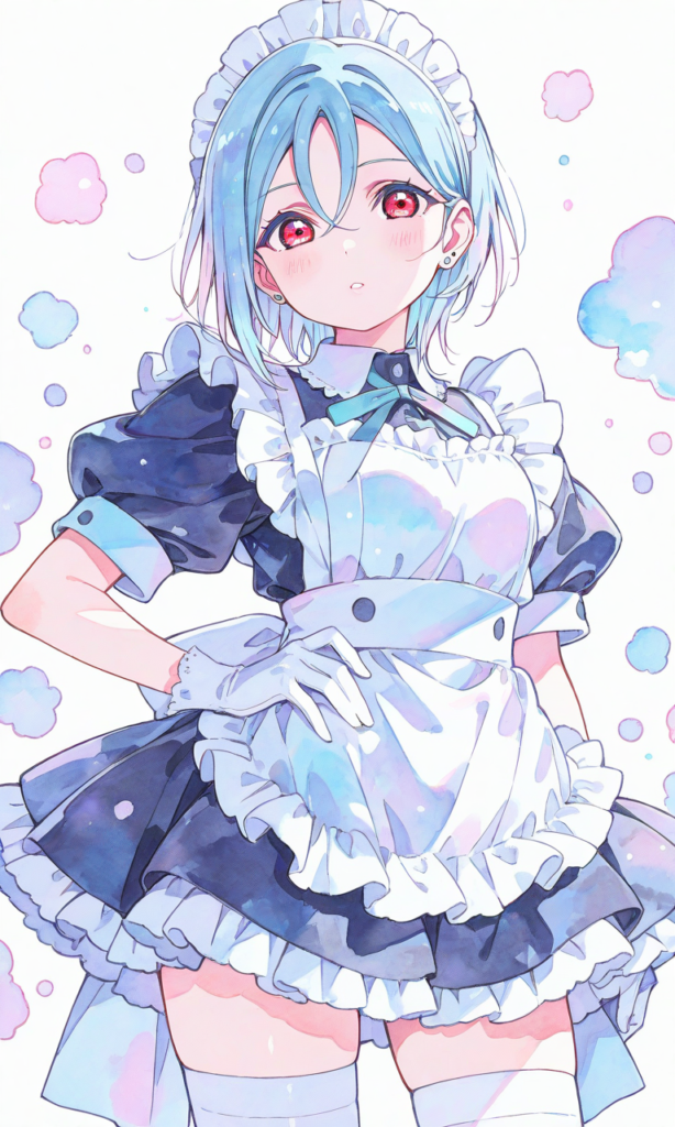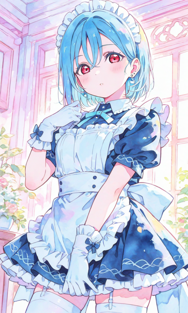 1girl, wakana shiki (love live), light blue hair, red eyes, maid, maid headdress, white gloves, white thighhighs, looking at viewer, cowboy shot, masterpiece, high resolution, high quality, high-res, , short hair, bangs, hair between eyes, earrings, stud earrings, watercolor, sketch style, watercolor effect, pastel colors