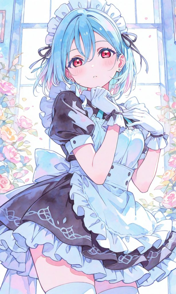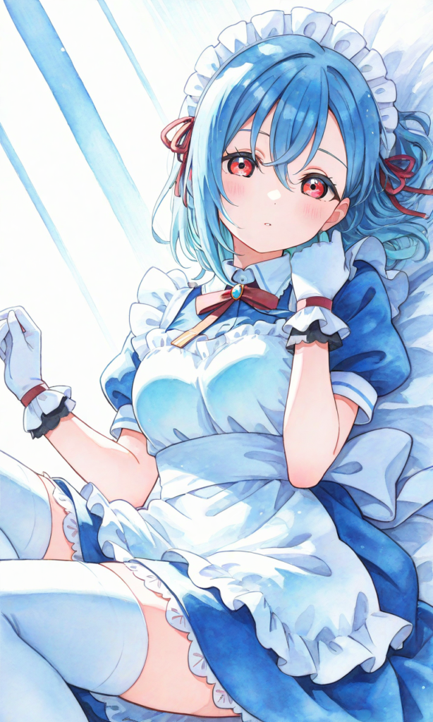 1girl, wakana shiki (love live), light blue hair, red eyes, maid outfit, maid headdress, white gloves, white thighhighs, looking at viewer, masterpiece, high resolution, high quality, high-res, [Watercolor], soft lines, harmonious color palette