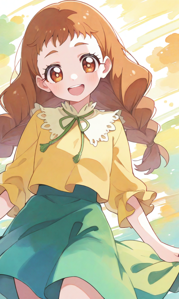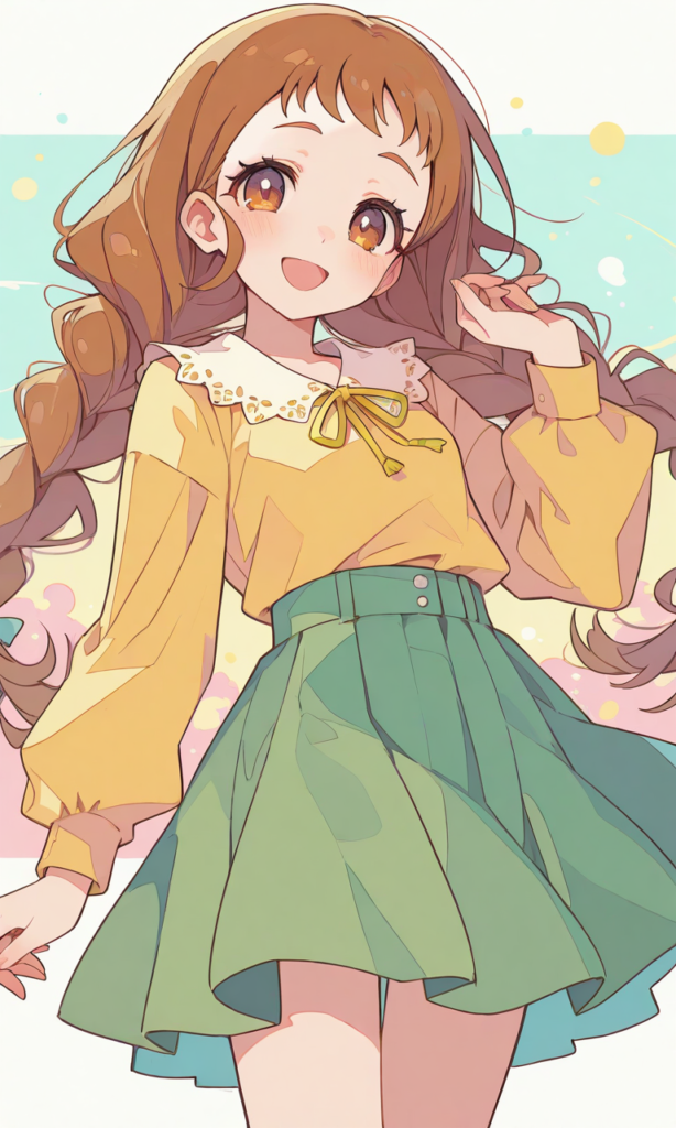 PixAI【Shiitake-Mix】arisugawa himari, brown hair, brown eyes, long hair, twin braids, yellow shirt, green skirt,smile,open mouth, cowboy shot,masterpiece,high quality, high resolution,high-res,Yuzukastyle, pastel colors,
