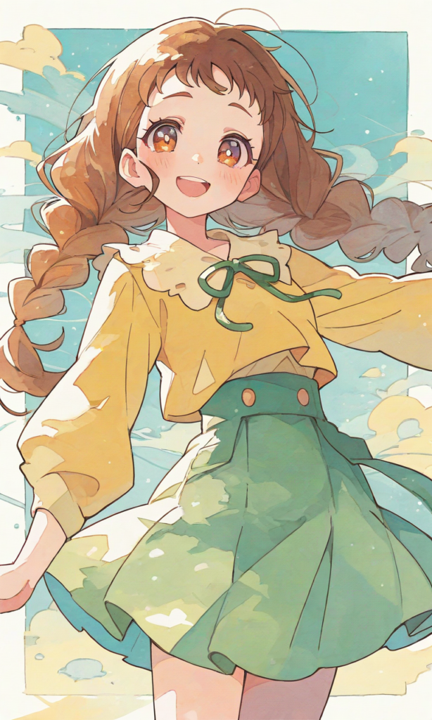 arisugawa himari, brown hair, brown eyes, long hair, twin braids, yellow shirt, green skirt,smile,open mouth, cowboy shot,masterpiece,high quality, high resolution,high-res,[Watercolor], soft lines, harmonious color palette ,Yuzukastyle, pastel colors,