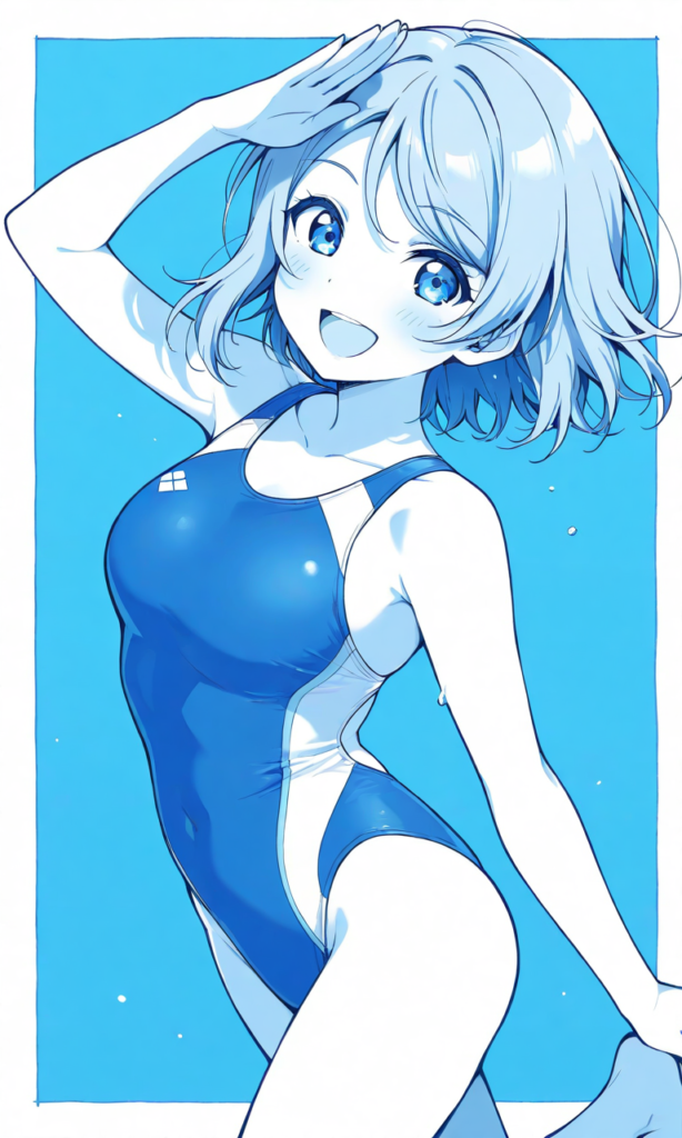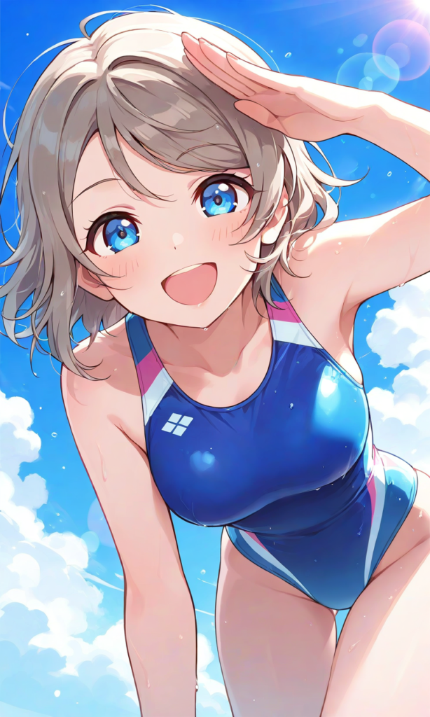 PixAI【Shiitake-Mix】watanabe you(lovelive), competition swimsuit, smile,open mouth, salute,leaning forward, looking at viewer, skipping, blue sky,hevy lens flare, cowboy shot,masterpiece,high quality, ,high-res,