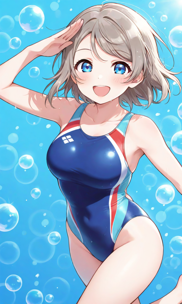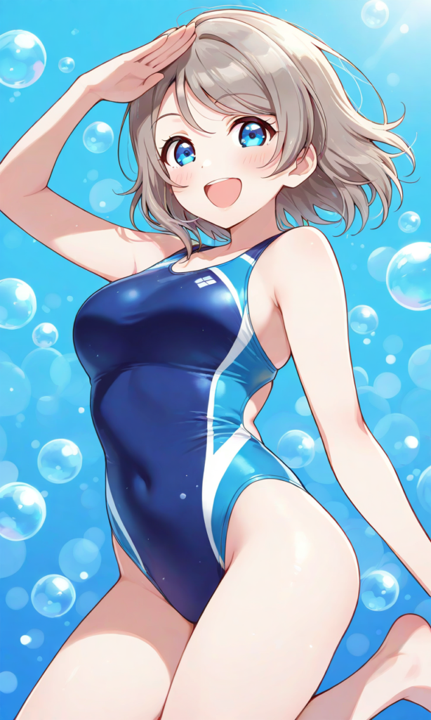 watanabe you(lovelive), competition swimsuit, smile,open mouth, salute,looking at viewer, skipping, bubble background,blue background, cowboy shot,masterpiece,high quality, ,high-res