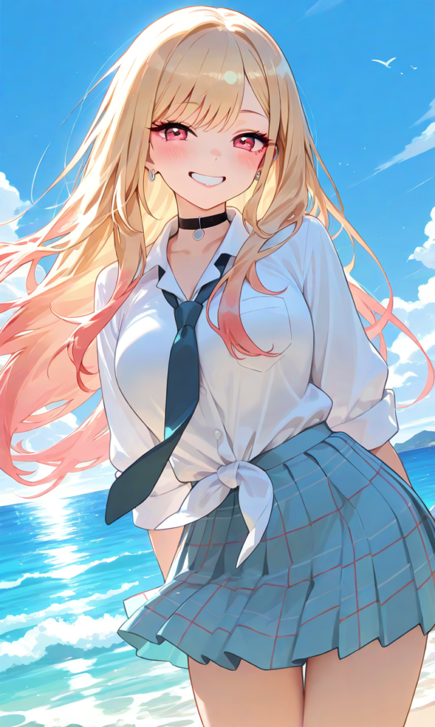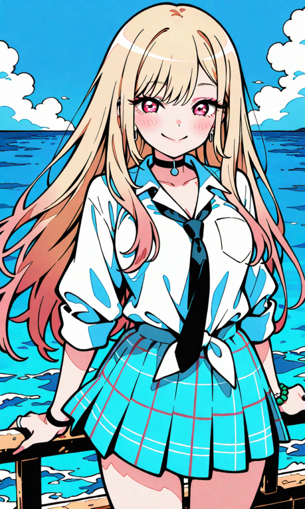 PixAI【Shiitake-Mix】kitagawa marin, school uniform, smile,looking at viewer, cowboy shot,ocean,blue sky, masterpiece,high quality, high resolution,high-res,{masterpiece}, ,{anime illustration},{Deformed},{best quality}, {illustration},{thick outline},{outlined vector graphics},{2d cel anime},{flat color style},{simple coloring style},Only one person depicted, big eyes, a short limbs,