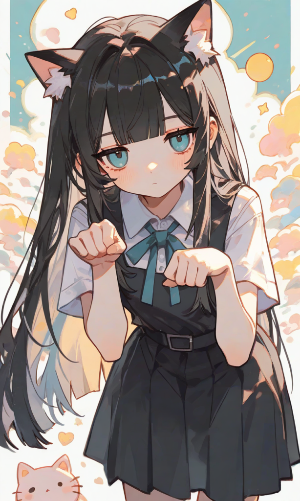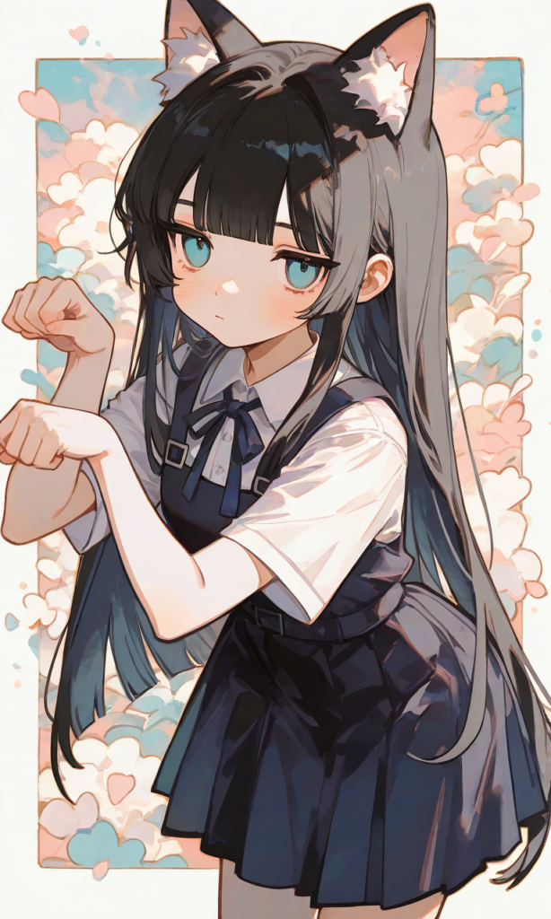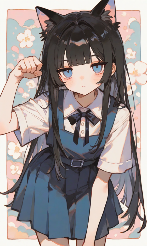 PixAI【Shiitake-Mix】girl,black hair, long hair, straight hair, blunt bangs,jitome,cat ears, school uniform, pinafore dress,white blouse,short sleeves, looking at viewer,cowboy shot,leaning forward, cat pose,masterpiece,high resolution,high quality, ,clndl_style,high-res,Yuzukastyle, pastel colors,