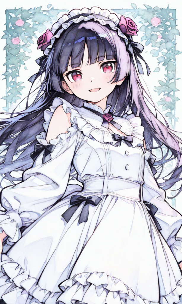 ore no imouto,gokou ruri,((no ears)), gothic lolita,white dress, pink frilled,long skirt,Lolita headdress, smugness,open mouth, smile,cowboy shot,masterpiece,high resolution,high quality, ,high-res,((sketch-like_outlines, watercolor_coloring, watercolor_texture, japanese_style, best_quality, ultra_detailed, lineart-heavy_style, sketch_style)),{masterpiece},{chibi} ,{chibi style anime illustration},{Deformed},{best quality}, {illustration},{thick outline},{outlined vector graphics},{2d cel anime},{flat color style},{simple coloring style},Only one person depicted, big eyes, a short limbs,