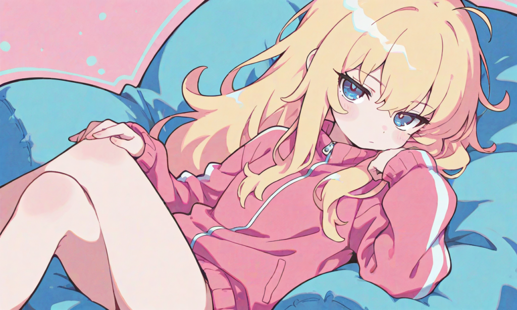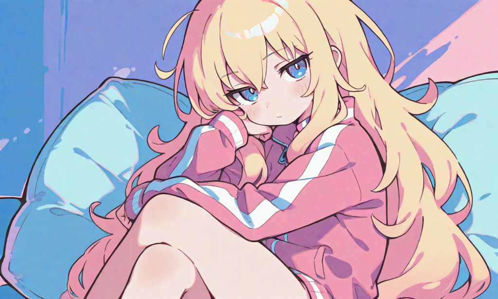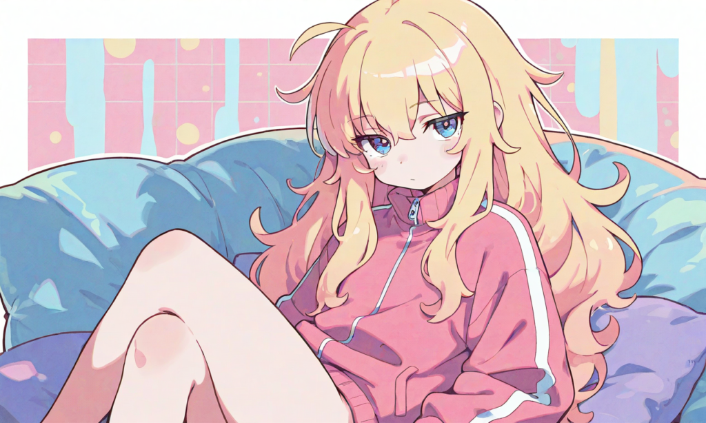 gabriel tenma white,((solo)), pink track suit, bottomless,bored, cowboy shot,looking at viewer, sitting on cushion,crossed legs, masterpiece,high quality, high resolution,high-res,{masterpiece},{anime illustration},{Deformed},{best quality}, {illustration},{thick outline},{outlined vector graphics},{2d cel anime},{flat color style},{simple coloring style},Only one person depicted, big eyes, a short limbs,pastel colors, soft pastel palette, cute illustration, big head small body, round face, soft shading, gentle colors, cozy atmosphere, soft lighting,neon pop art style