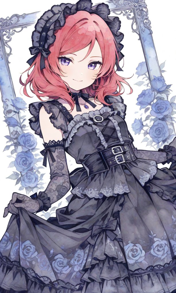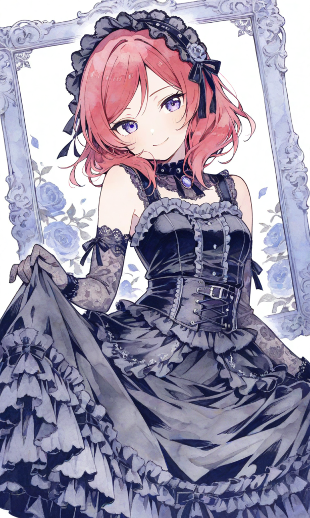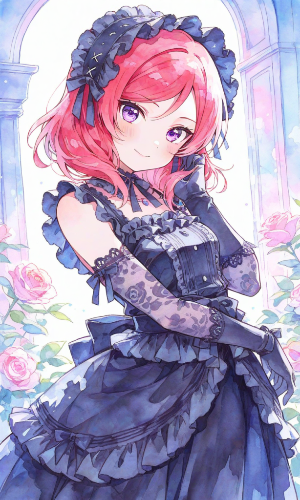 PixAI【Shiitake-Mix】lovelive,nishikino maki, smile,gothic lolita,white frilled,long skirt, lace elbow gloves, cowboy shot,masterpiece,high resolution,high quality, ,high-res,watercolor, sketch style, watercolor effect, pastel colors