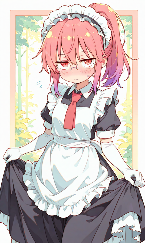 PixAI【Shiitake-Mix】kobayashi (maidragon), solo,ponytail, sanpaku,jitome,glasses,embarrassed,blush,maid,white elbow gloves,maid headdress,red necktie, long skirt, curtsey, looking at viewer, cowboy shot,outside border, masterpiece,high resolution,high quality, ,Yuzukastyle, pastel colors,
