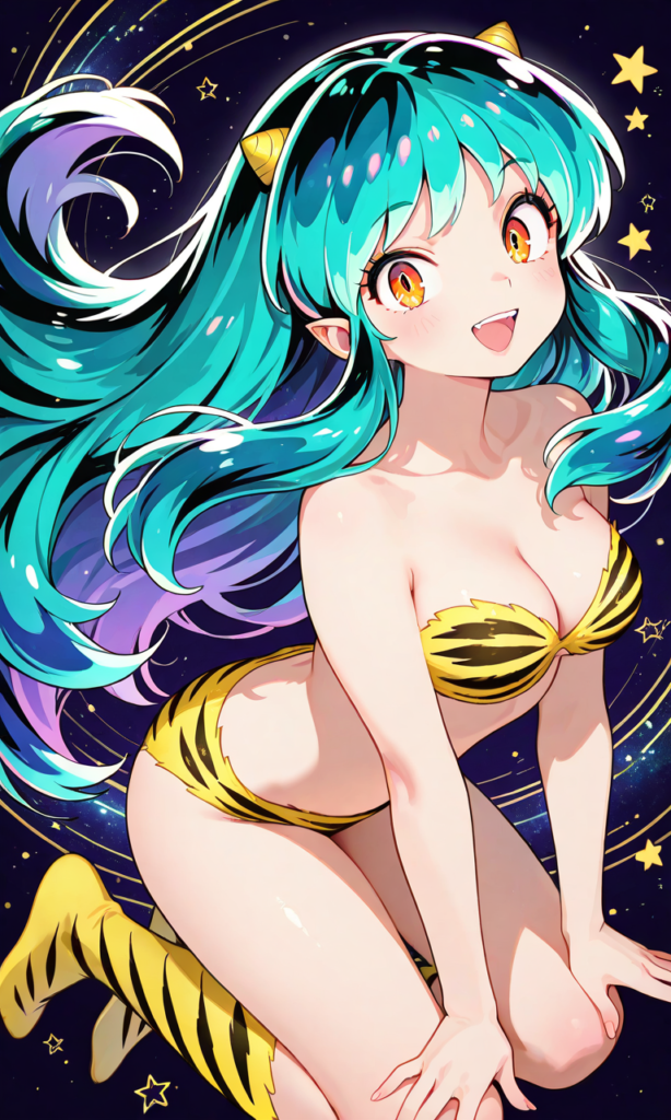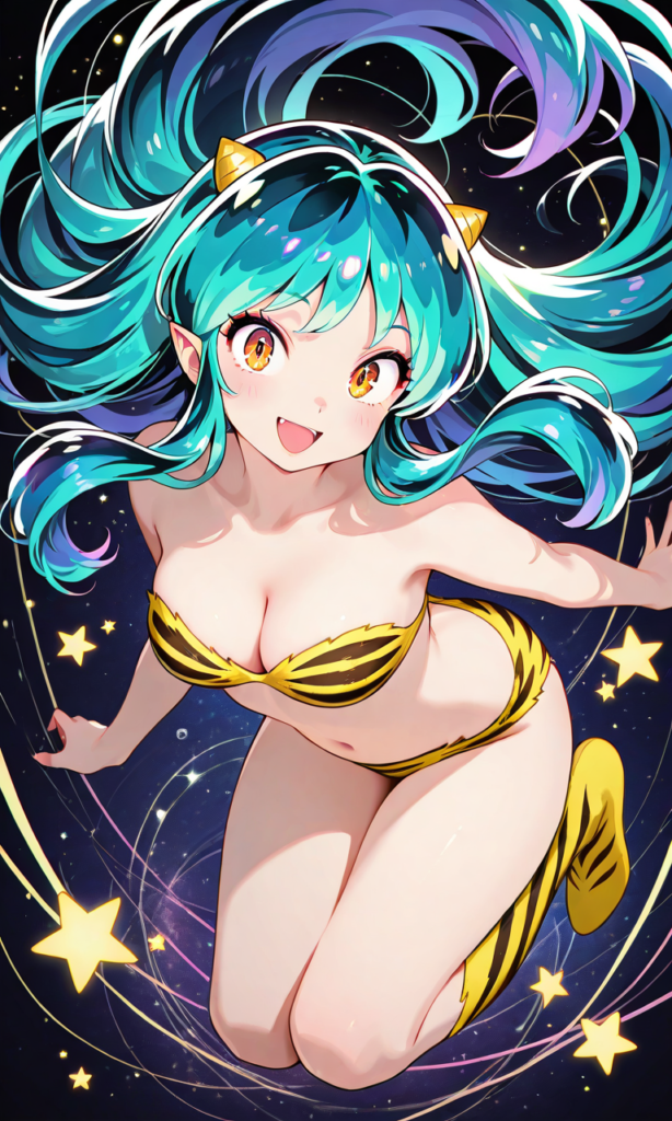 PixAI【Shiitake-Mix】urusei yatsura,Lum,bikini,smile,open mouth, floating, looking at viewer,star (symbol), big star,gradation background, masterpiece,high resolution,high quality, ,