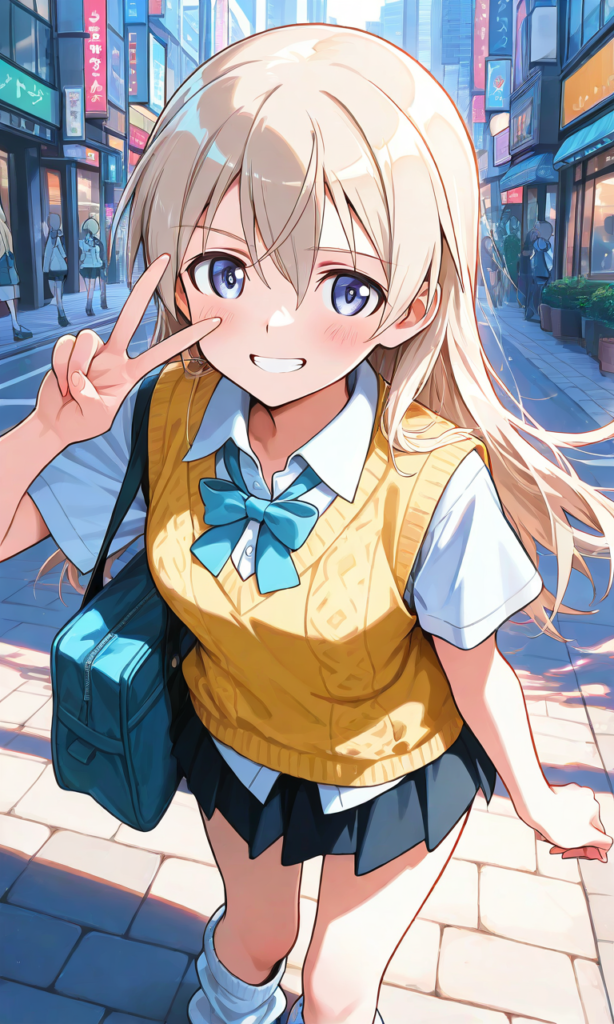 PixAI【Shiitake-Mix】Eila Ilmatar Juutilainen(STRIKE WITCHES),no hair ornament, school uniform,dress shirt, short sleeves,neck bowtie,miniskirt, yellow knit vest,loose socks,looking at viewer, v,grin, selfie, cowboy shot,shibuya city,sidewalk, masterpiece,high quality,high resolution ,high-res,