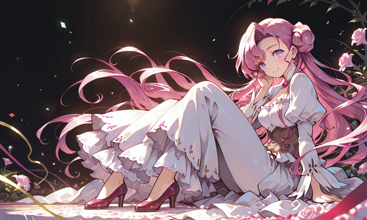 PixAI【Shiitake-Mix】Euphemia li Britannia, smile,looking at viewer, full body,simple background, black background, from side, confetti,sitting,high heels, masterpiece,high quality,high resolution , Fantasy Scene,tokiame, Fantasy Scene, ,hyper-detailed, high contrast, depth of field, ray tracing, best lighting, cinematic composition, beautiful face, beautiful eyes, sharp focus, (masterpiece:1.2), (best quality:1.2), (very aesthetic:1.2), (absurdres:1.2), (detailed background),