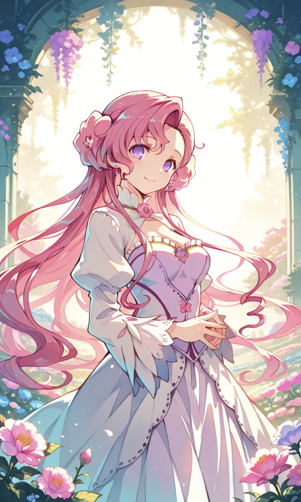 Euphemia li Britannia, smile,looking at viewer, cowboy shot,flower garden, masterpiece,high quality,high resolution , Fantasy Scene,tokiame, Fantasy Scene, ,cinematic lighting , cinematic angle, soft light , color detail, backlighting, Depth of field, long exposure, light steps, intricate colors, vibrant colors,