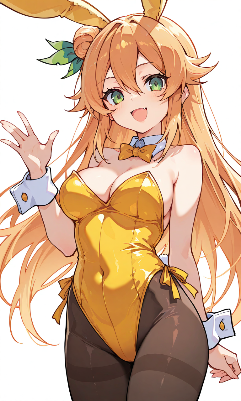 PixAI【Shiitake-Mix】hinatsuki mikan, yellow bunnygirl,pantyhose, smile,open mouth, cowboy shot,simplebackground,white background, masterpiece,high quality, high resolution,tokiame