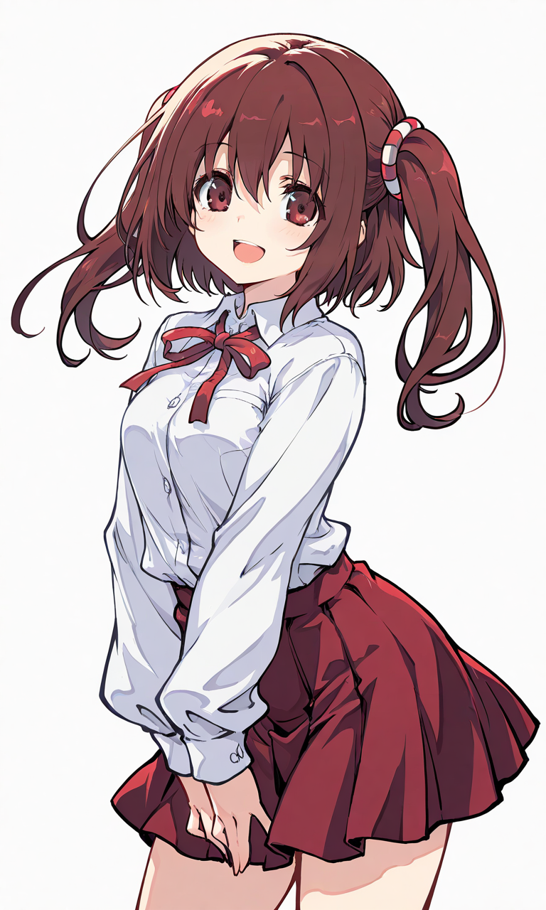 PixAI【Shiitake-Mix】ebina nana,school uniform,white dress shirt,long sleeves, red neckribbon,red skirt, smile,open mouth, cowboy shot,simplebackground,white background, masterpiece,high quality, ,tokiame