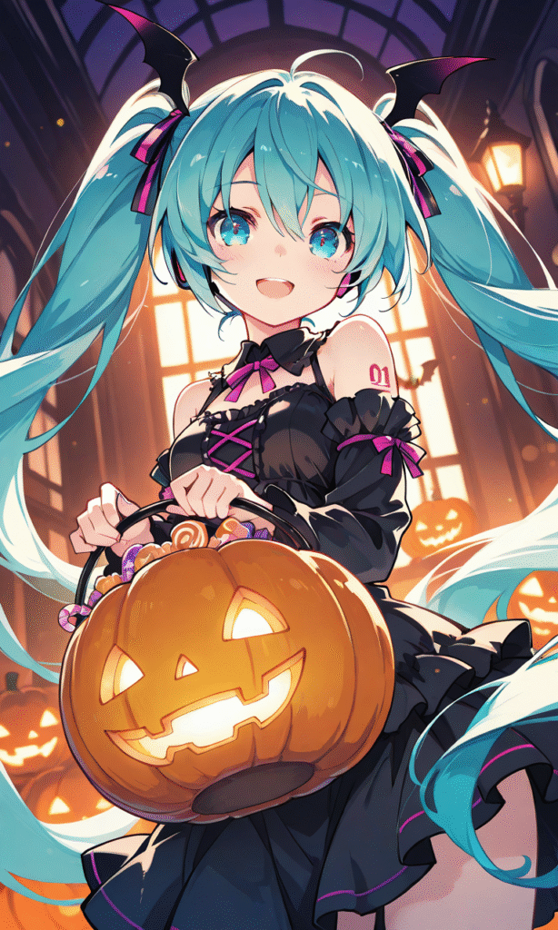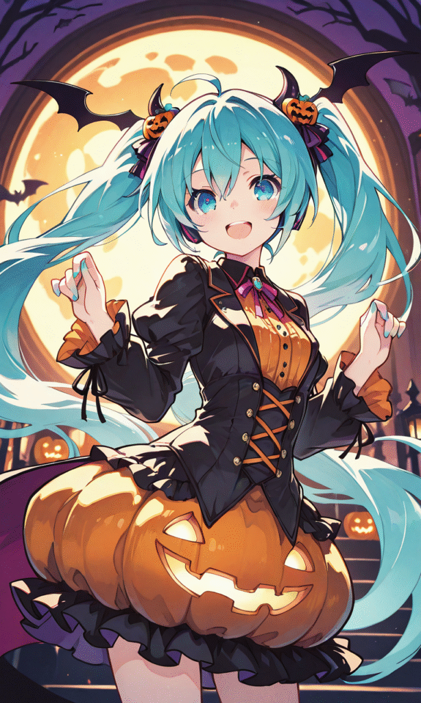 PixAI【Shiitake-Mix】hatsune miku,halloween costume, smile, open mouth, cowboy shot,halloween night, masterpiece,high resolution,high quality, ,tokiame,cinematic lighting , cinematic angle, soft light , color detail, backlighting, Depth of field, long exposure, light steps, intricate colors, vibrant colors,