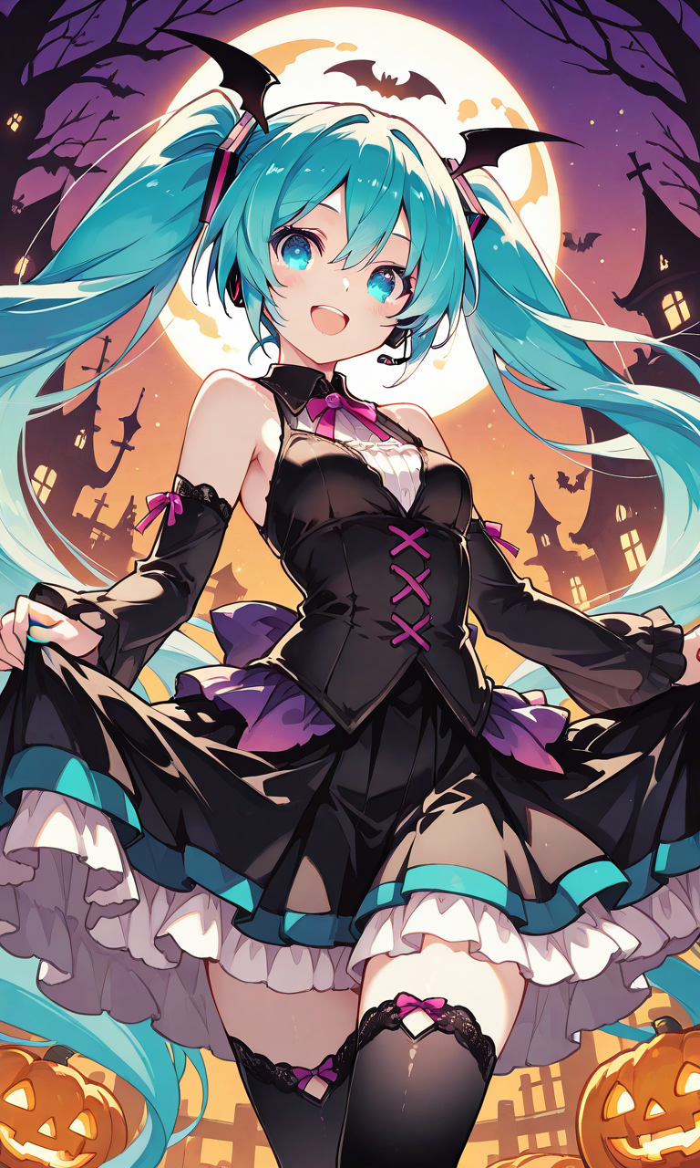 PixAI【Shiitake-Mix】hatsune miku,halloween costume, smile, open mouth, cowboy shot,halloween night, masterpiece,high resolution,high quality, ,tokiame,cinematic lighting , cinematic angle, soft light , color detail, backlighting, Depth of field, long exposure, light steps, intricate colors, vibrant colors,
