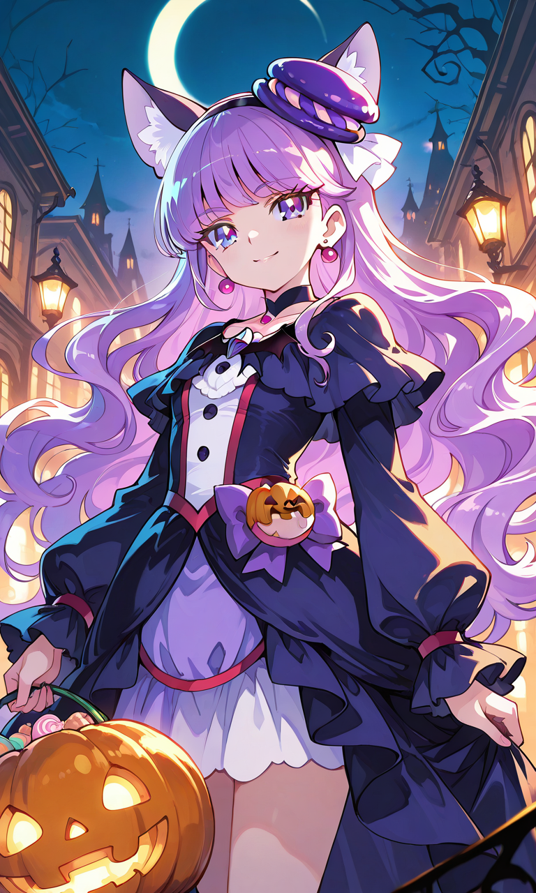 PixAI【Shiitake-Mix】precure,cure macaron,purple eyes,long hair, wavy hair,volumey,smile,((halloween costume)), cowboy shot,purple hair, thurime,night sky,halloween, masterpiece,high quality, high resolution,cinematic lighting , cinematic angle, soft light , color detail, backlighting, Depth of field, long exposure, light steps, intricate colors, vibrant colors,tokiame,cinematic lighting , cinematic angle, soft light , color detail, backlighting, Depth of field, long exposure, light steps, intricate colors, vibrant colors, Fantasy Scene,