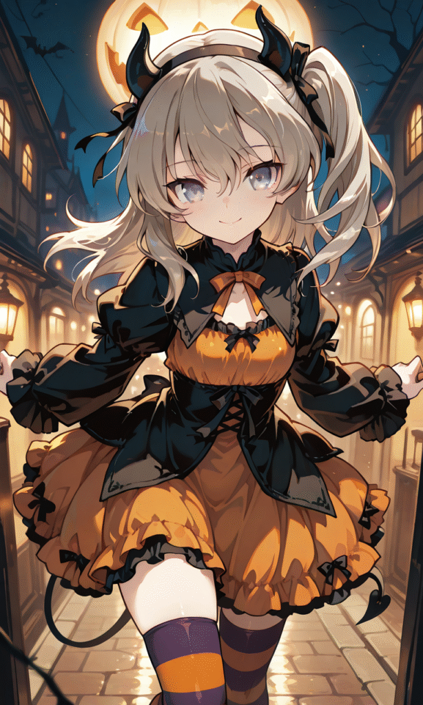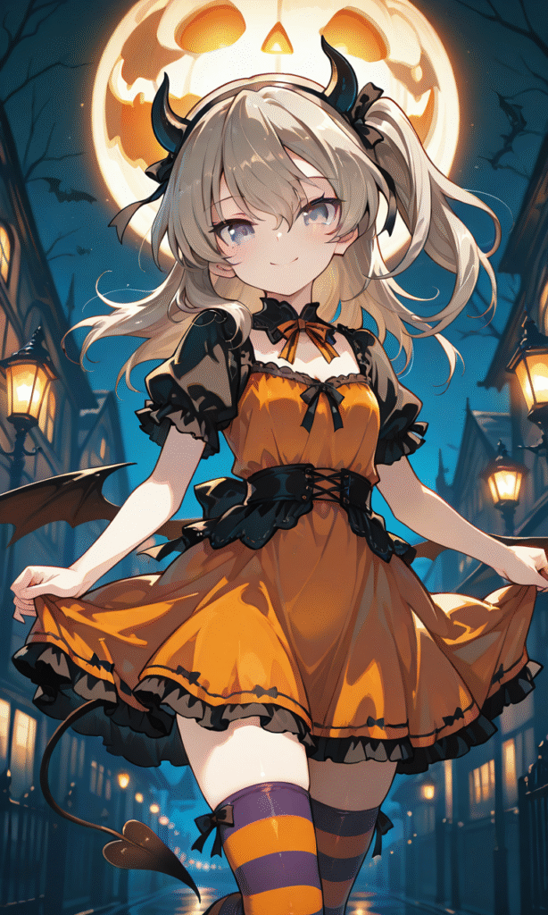 PixAI【Shiitake-Mix】shimada arisu, smile, orange dress, striped thighhighs (black&orange), cowboy shot, halloween, night sky, masterpiece, skipping, high resolution, tokiame, hyper-detailed, high contrast, depth of field, ray tracing, best lighting, cinematic composition, beautiful face, beautiful eyes, sharp focus, (masterpiece:1.2), (best quality:1.2), (very aesthetic:1.2), (absurdres:1.2), (detailed background)