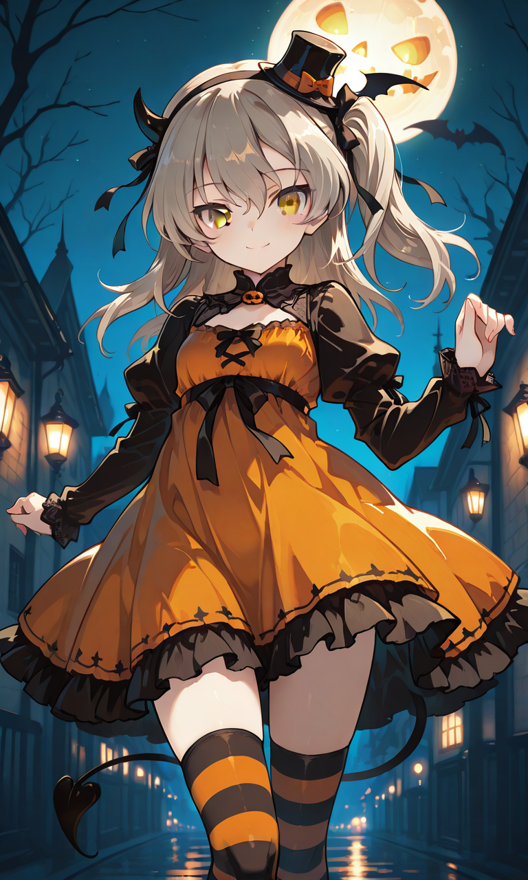 PixAI【Shiitake-Mix】shimada arisu, smile, orange dress, striped thighhighs (black&orange), cowboy shot, halloween, night sky, masterpiece, skipping, high resolution, tokiame, hyper-detailed, high contrast, depth of field, ray tracing, best lighting, cinematic composition, beautiful face, beautiful eyes, sharp focus, (masterpiece:1.2), (best quality:1.2), (very aesthetic:1.2), (absurdres:1.2), (detailed background)