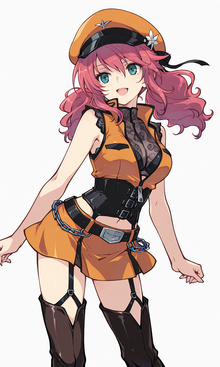feldt grace(gundam 00), 1girl, orange military beret, military long vest with large zipper, lace sleeveless blouse, bikini, belt corset, zippered mini skirt with lace, chain belt, garter belt, long boots with belts, smile, open mouth, cowboy shot, simple background, white background, masterpiece, high quality, high resolution, tokiame style, tokiame