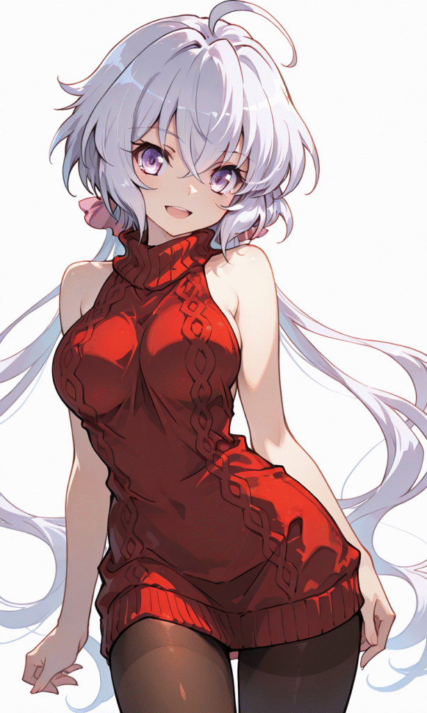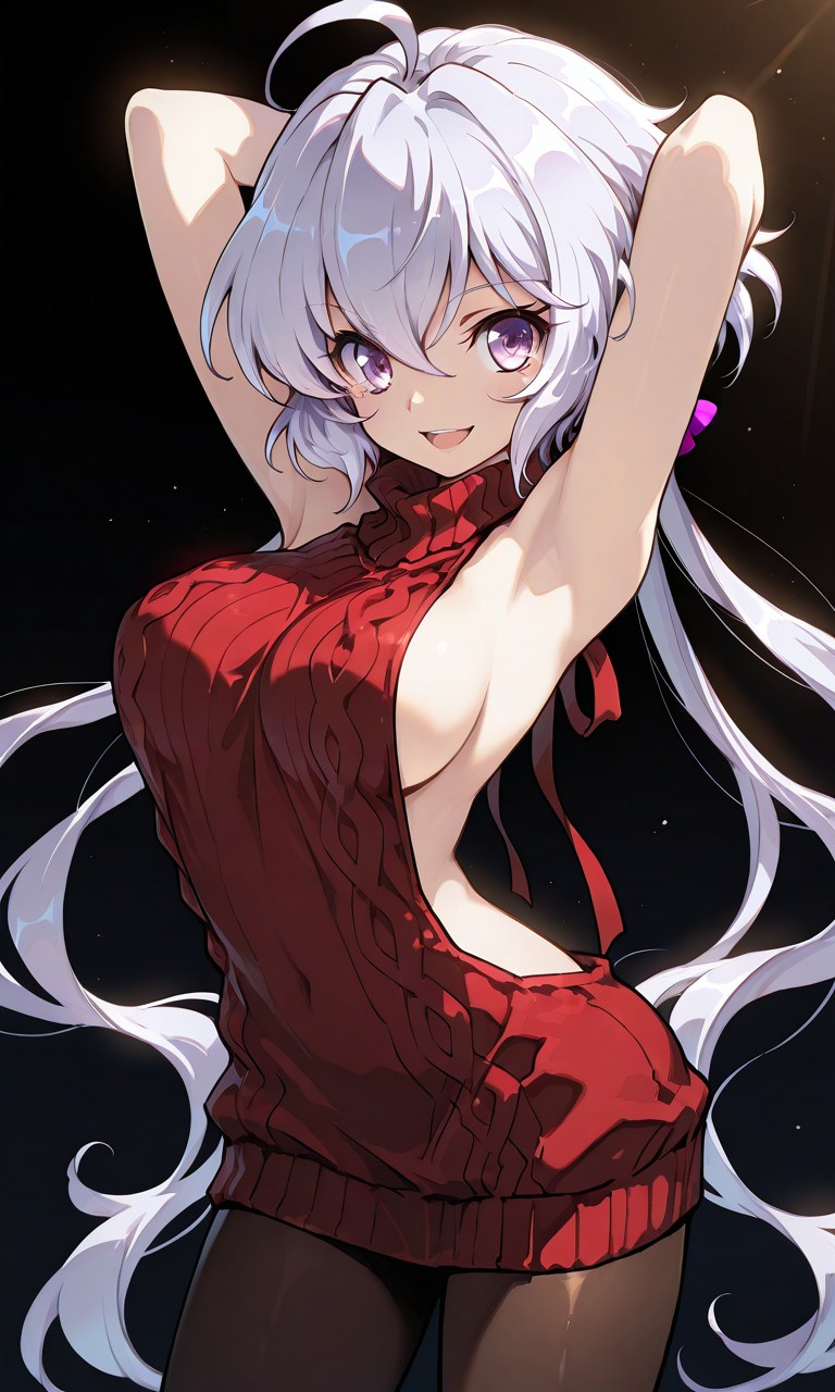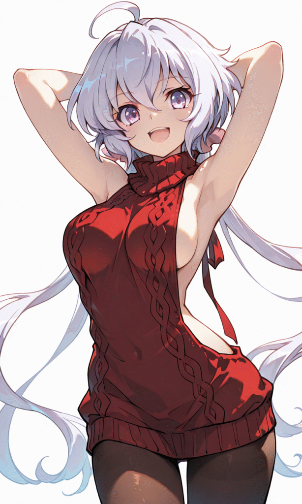 PixAI【Shiitake-Mix】1girl, yukine chris(symphogear), red virgin killer sweater, pantyhose, smile, open mouth, arms behind head, cowboy shot, simple background, white background, masterpiece, high quality, high resolution, tokiame, hyper-detailed, high contrast, depth of field, ray tracing, best lighting, cinematic composition, beautiful face, beautiful eyes, sharp focus, (masterpiece:1.2), (best quality:1.2), (very aesthetic:1.2), (absurdres:1.2), (detailed background)