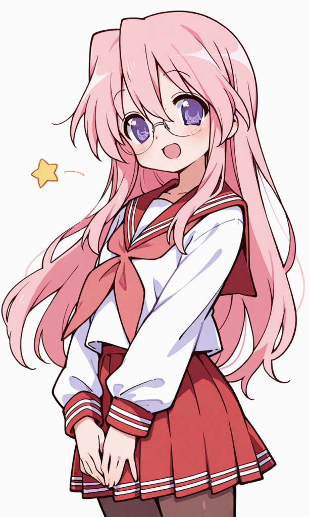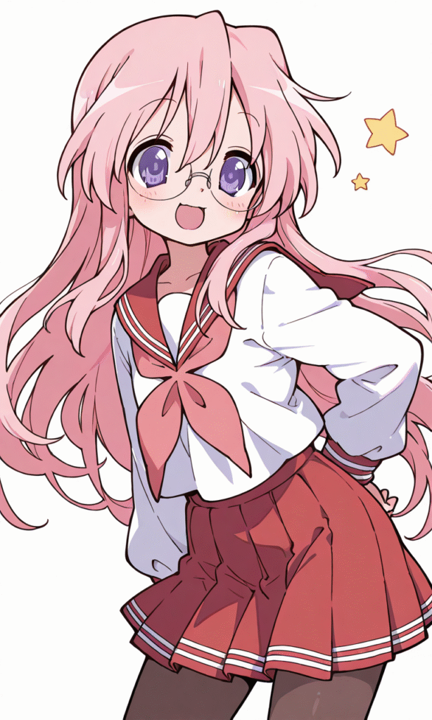 PixAI【Shiitake-Mix】takara miyuki(lucky star), 1girl, serafuku, red sailor color, pleated skirt, pantyhose, long sleeves, smile, open mouth, cowboy shot, simple background, white background, masterpiece, high quality, high resolution, tokiame (artist)