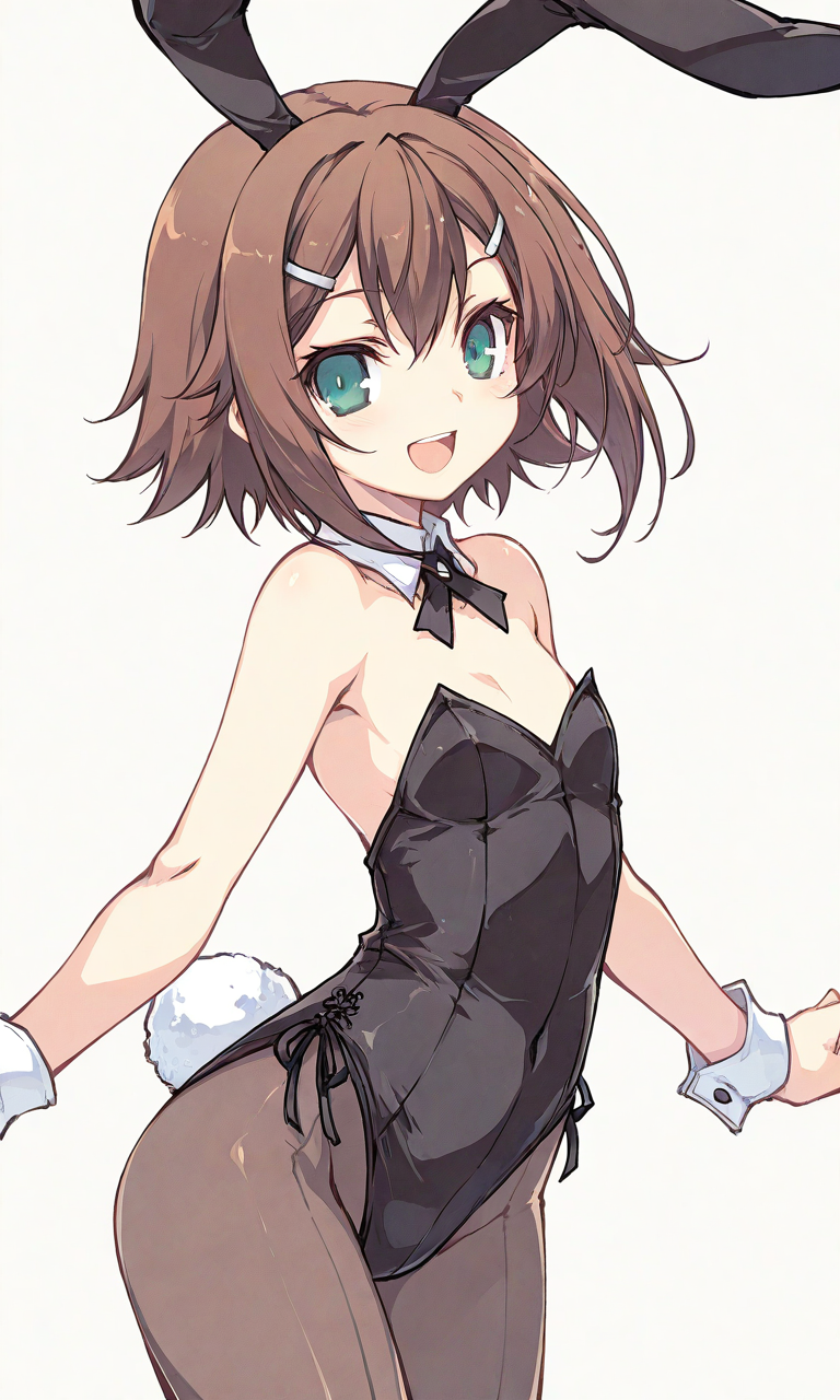 PixAI【Shiitake-Mix】kinoshita hideyoshi(baka to test to shoukanjuu), 1girl, bunnygirl, white hairclip, flat chest, smile, open mouth, cowboy shot, simple background, white background, masterpiece, high quality, high resolution, artist:tokiame, artist:tokiame