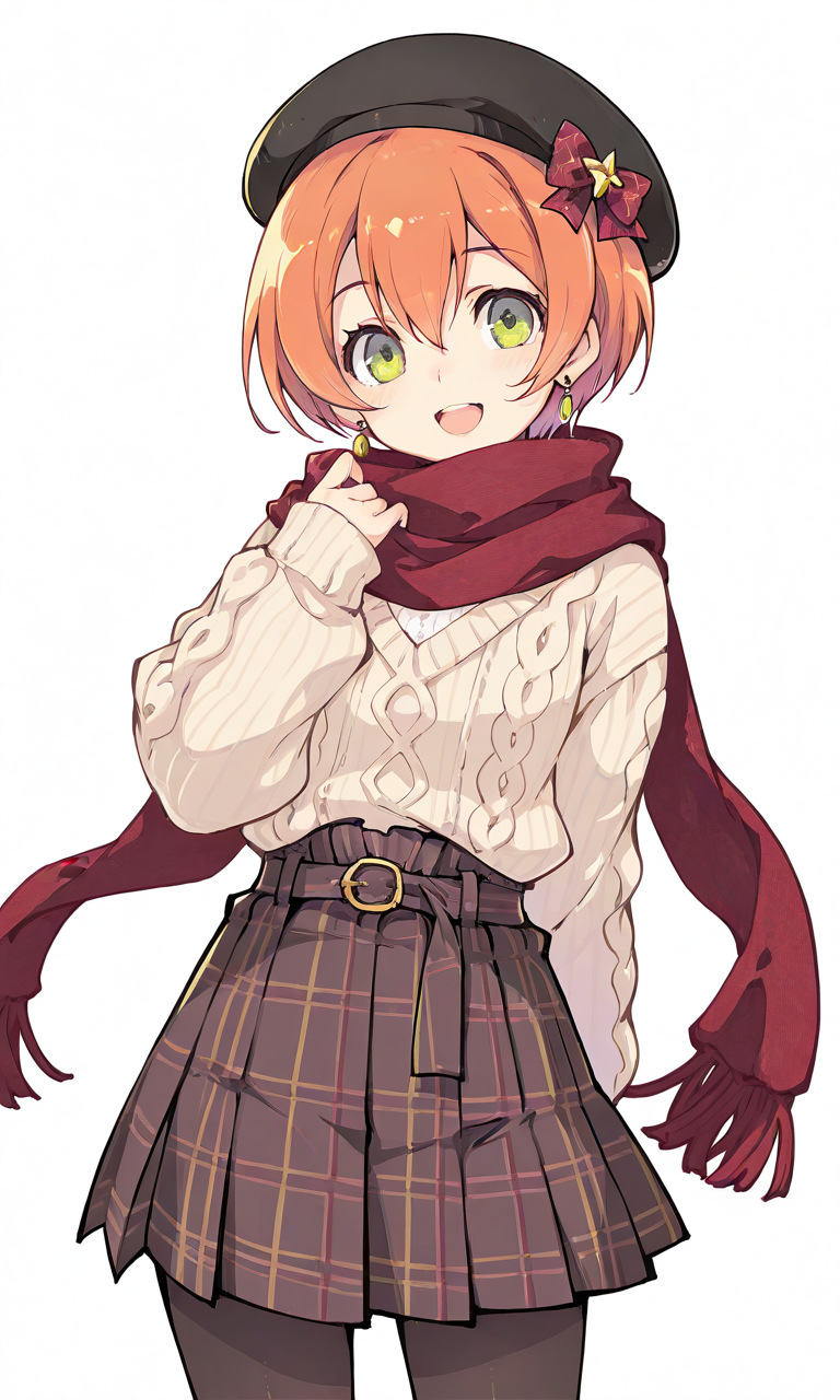 hoshizora rin, 1girl, cozy beige knit sweater, high-waisted brown pleated skirt, dark red scarf, black beret, black tights, gold earrings, subtle plaid pattern accents, smile, open mouth, cowboy shot, simple background, white background, masterpiece, high quality, tokiame (artist), tokiame