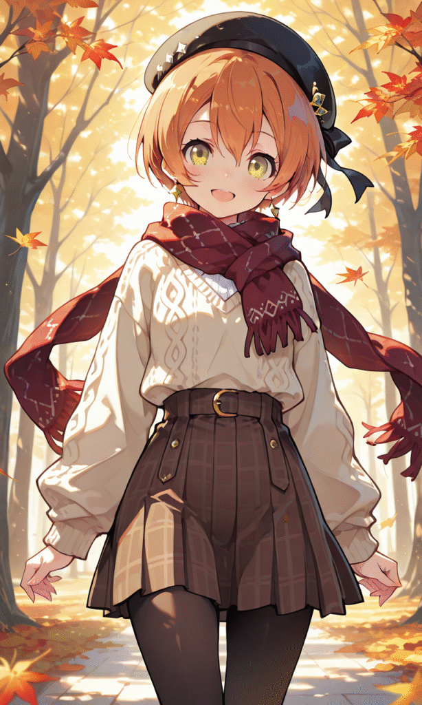 PixAI【Shiitake-Mix】hoshizora rin, cozy beige knit sweater, high-waisted brown pleated skirt, dark red scarf, black beret, black tights, gold earrings, subtle plaid pattern accents, smile, open mouth, cowboy shot, autumn, masterpiece, high quality, tokiame, hyper-detailed, high contrast, depth of field, ray tracing, best lighting, cinematic composition, beautiful face, beautiful eyes, sharp focus, (masterpiece:1.2), (best quality:1.2), (very aesthetic:1.2), (absurdres:1.2), detailed background