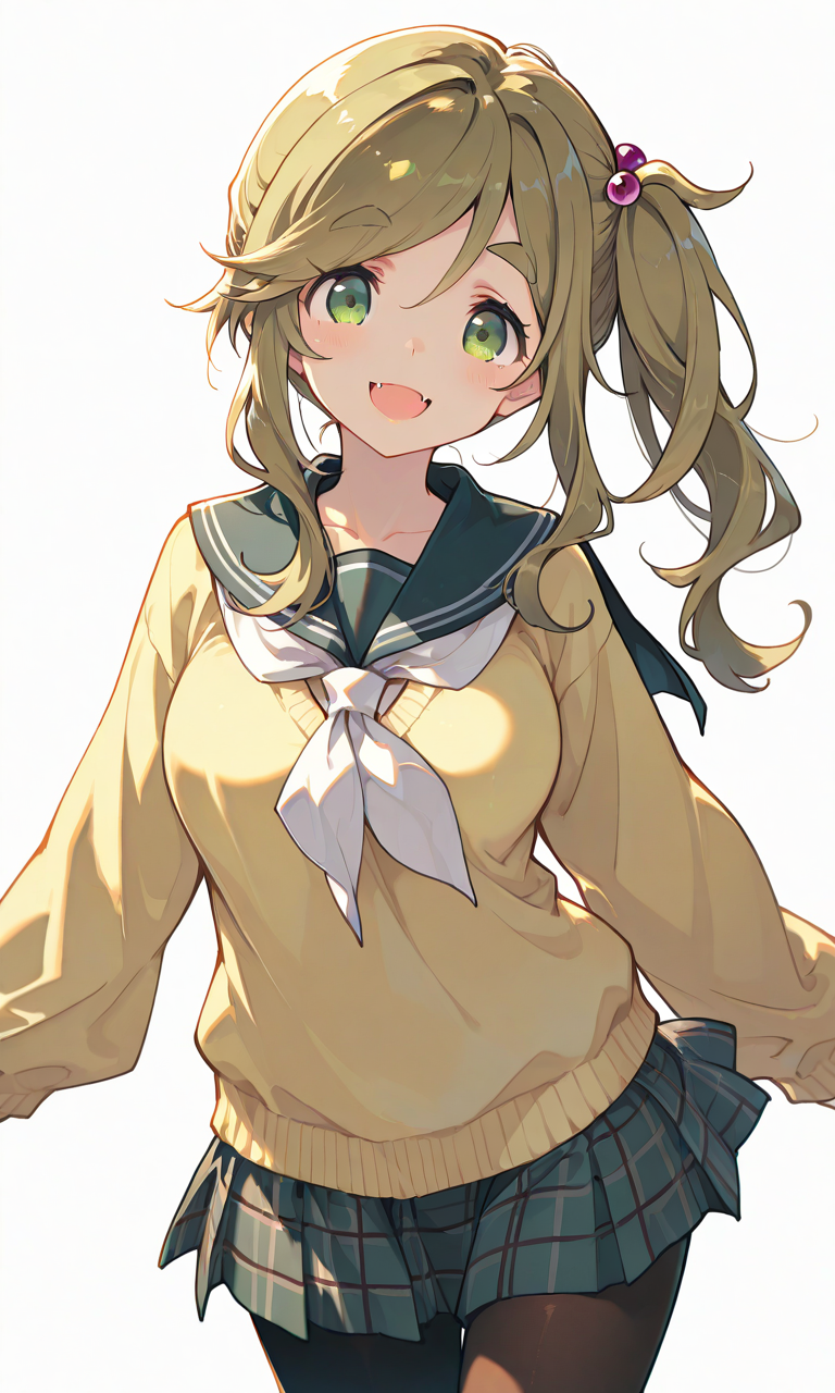 PixAI【Shiitake-Mix】inuyama aoi, serafuku, yellow sweater, plaid skirt, pantyhose, smile, open mouth, cowboy shot, simple background, white background, masterpiece, high quality, high resolution, tokiame, hyper-detailed, high contrast, depth of field, ray tracing, best lighting, cinematic composition, beautiful face, beautiful eyes, sharp focus, (masterpiece:1.2), (best quality:1.2), (very aesthetic:1.2), (absurdres:1.2), (detailed background)