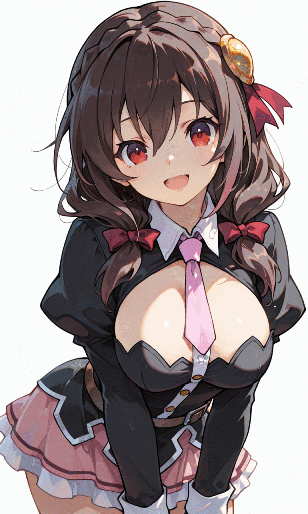 yunyun(konosuba), 1girl, smile, open mouth, looking at viewer, leaning forward, cowboy shot, simple background, ((white background)), masterpiece, high quality, high resolution, tokiame, hyper-detailed, high contrast, depth of field, ray tracing, best lighting, cinematic composition, beautiful face, beautiful eyes, sharp focus, (masterpiece:1.2), (best quality:1.2), (very aesthetic:1.2), (absurdres:1.2), (detailed background)