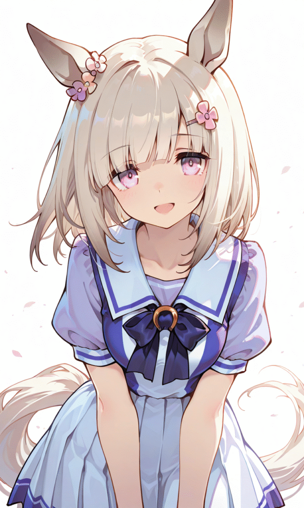 PixAI【Shiitake-Mix】happy meek (umamusume),tracen school uniform, smile,open mouth,wind lift, leaf, cowboy shot,simplebackground,white background, masterpiece,high quality, high resolution
