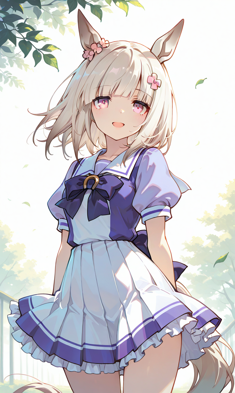 PixAI【Shiitake-Mix】happy meek (umamusume),tracen school uniform, smile,open mouth,wind lift, leaf, cowboy shot,simplebackground,white background, masterpiece,high quality, high resolution