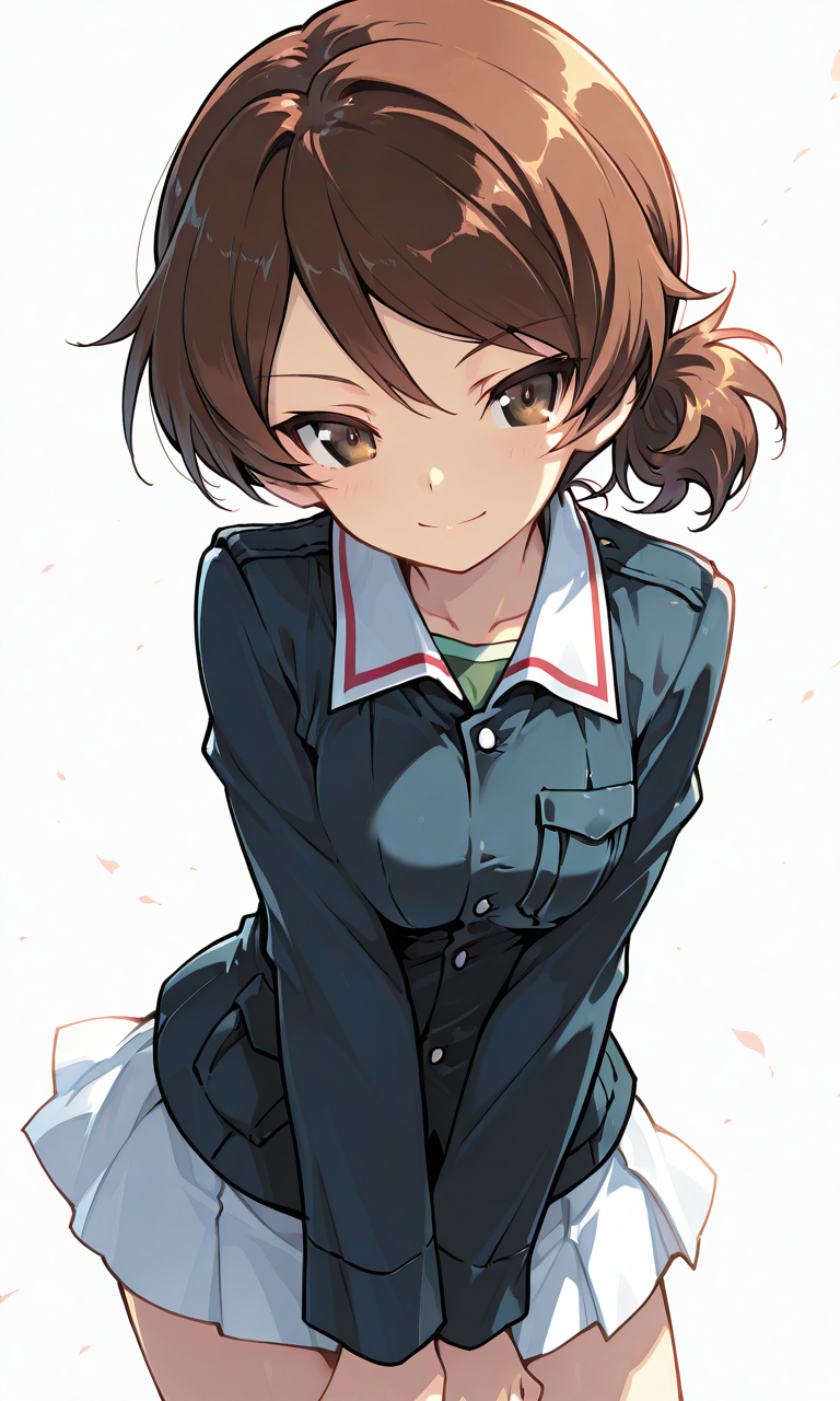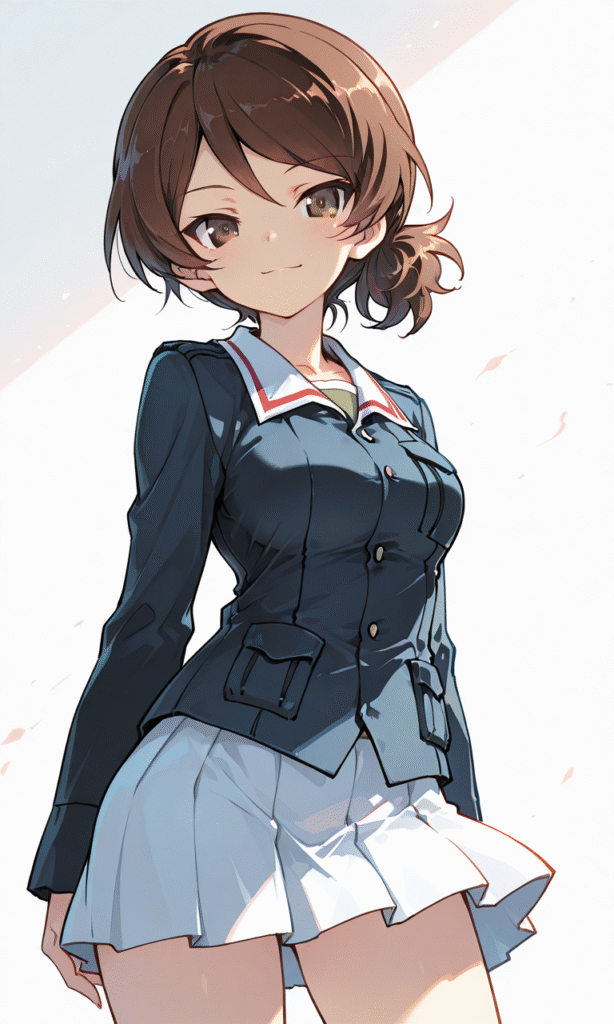 PixAI【Shiitake-Mix】kawanishi shinobu(GIRLS und PANZER), ooarai military uniform, cowboy shot, simple background, white background, masterpiece, high quality, high resolution, tokiame, hyper detailed, high contrast, depth of field, ray tracing, best lighting, cinematic composition, beautiful face, beautiful eyes, sharp focus, (masterpiece:1.2), (best quality:1.2), (very aesthetic:1.2), (absurdres:1.2), detailed background