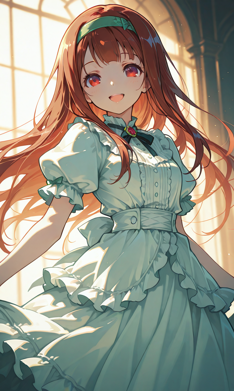 PixAI【Shiitake-Mix】1girl, tanaka kotoha, smile, open mouth, layered tulle skirt, morning mist, purple frilled dress, puffy short sleeves, poetic, mystical, serene, cowboy shot, masterpiece, high quality, high resolution, tokiame, hyper-detailed, high contrast, depth of field, ray tracing, best lighting, cinematic composition, beautiful face, beautiful eyes, sharp focus