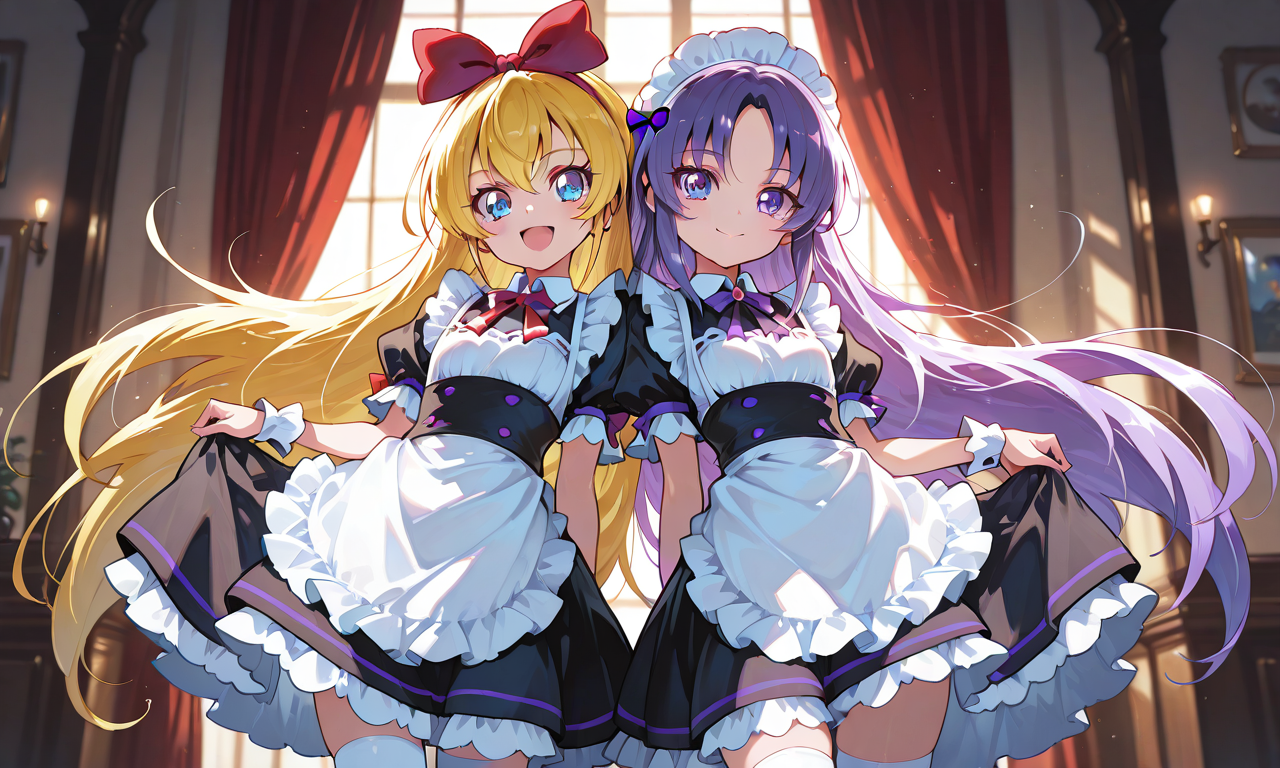 PixAI【Shiitake-Mix】2girls,hikawa iona(purple eyes), regina (dokidoki! precure,blue eyes,red hairribon ),maid, white thighhighs, smile,open mouth,shoulder-to-shoulder, cowboy shot,simplebackground,white background, masterpiece,high quality, high resolution,tokiame,hyper-detailed, high contrast, depth of field, ray tracing, best lighting, cinematic composition, beautiful face, beautiful eyes, sharp focus, (masterpiece:1.2), (best quality:1.2), (very aesthetic:1.2), (absurdres:1.2), (detailed background),