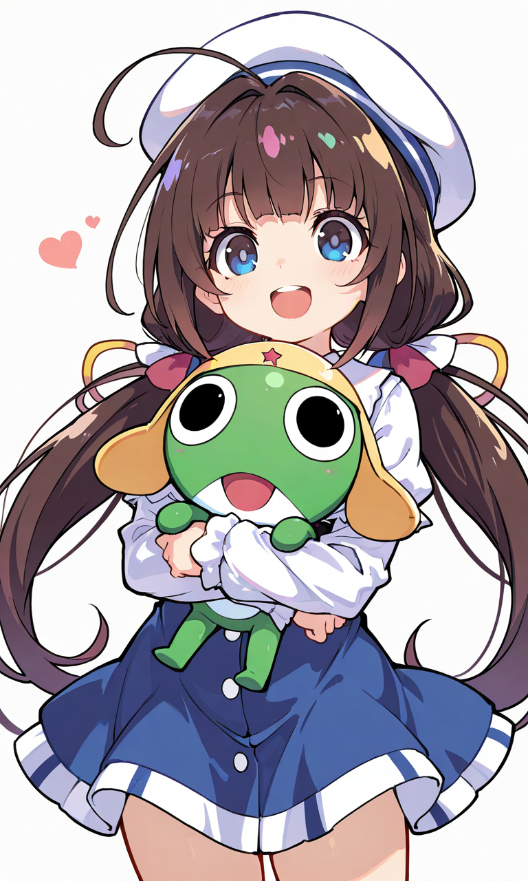 AIPixAI【Shiitake-Mix】hinatsuru ai,beret, holding keroro, smile,open mouth, cowboy shot,simplebackground,white background, masterpiece,high quality, high resolution,tokiame