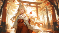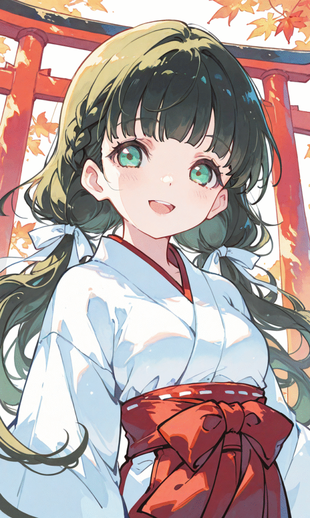 PixAI【Shiitake-Mix】sakurakoji kinako(love live), 1girl, green eyes, miko, smile, open mouth, looking at viewer, upper body, autumn, torii, simple background, white background, masterpiece, high quality, high resolution, tokiame, NineV, watercolor