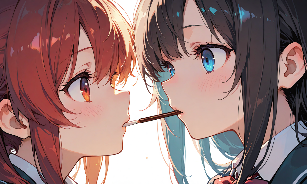 PixAI【Shiitake-Mix】2girls, pocky, holding pocky with mouth, looking at each other, masterpiece, school_uniform, blushing, close-up, simple background, white background, high quality, high resolution, tokiame, hyper-detailed, high contrast, depth of field, ray tracing, best lighting, cinematic composition, beautiful face, beautiful eyes, sharp focus, (masterpiece:1.2), (best quality:1.2), (very aesthetic:1.2), (absurdres:1.2), (detailed background)